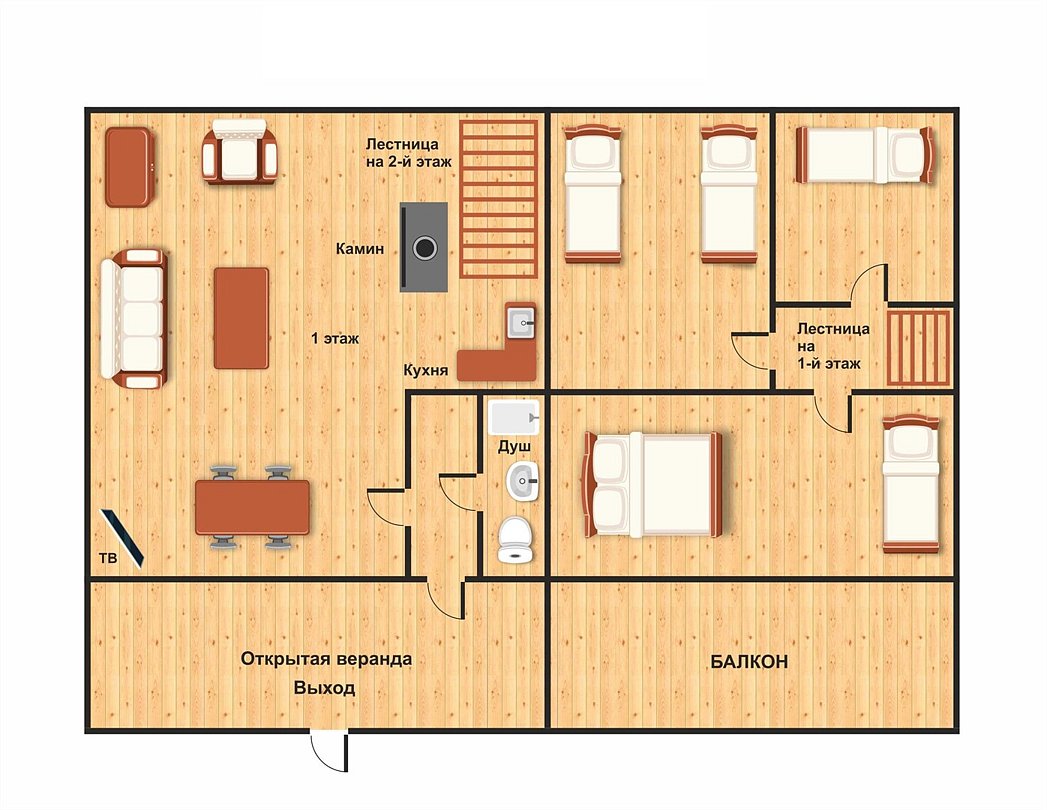 75 м2 · 8-и местный коттедж + 2 доп. места