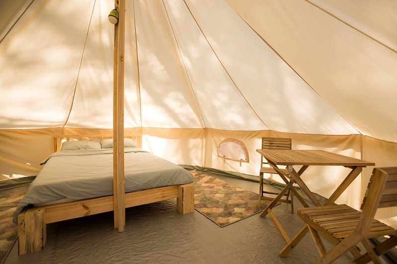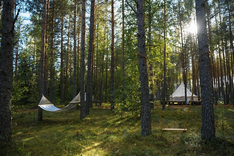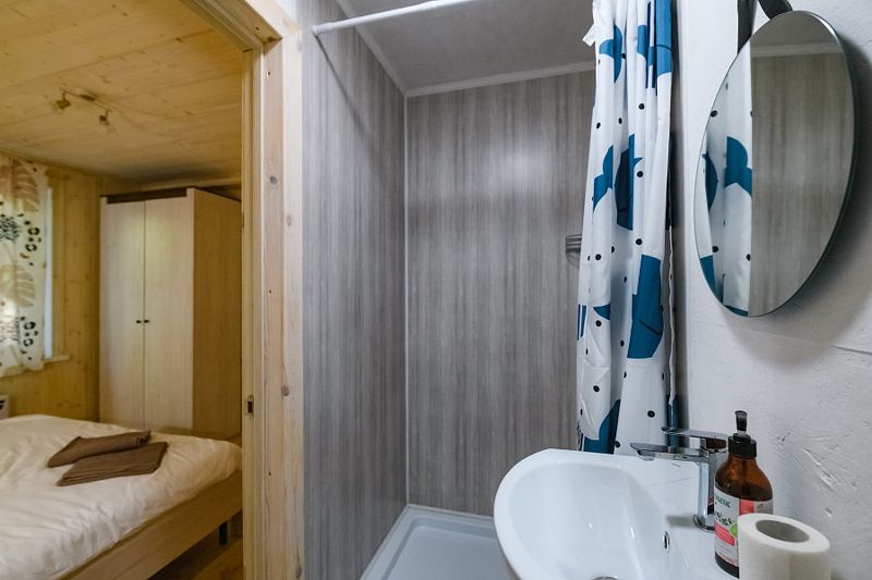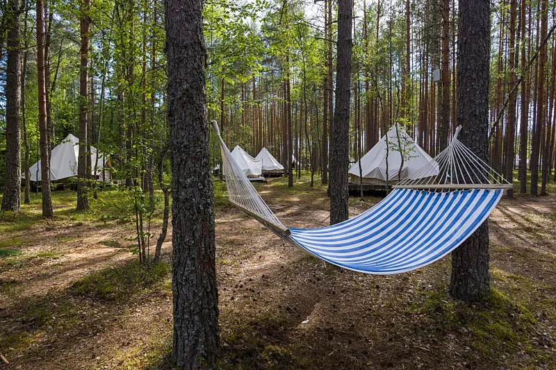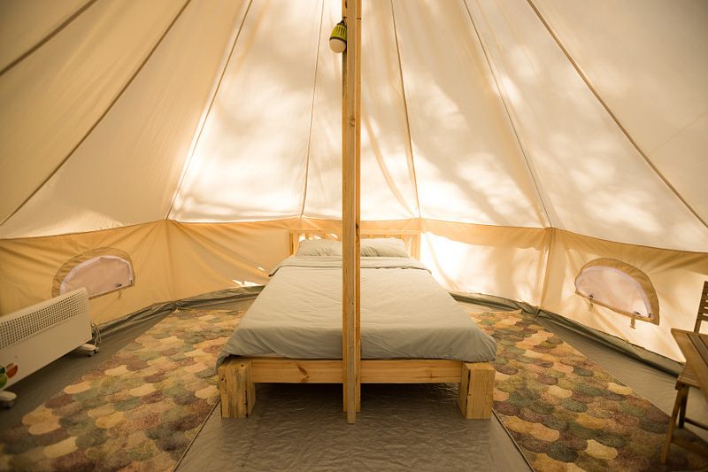 Глэмпинг предлагает комфортные шатры с удобной мебелью, отоплением и электричеством. Для любителей кемпинга есть 6-местные палатки и площадки для автодомов с подключением воды и электричества. Гостям доступны летний душ и современный туалет.
