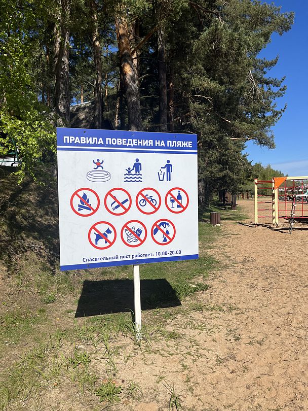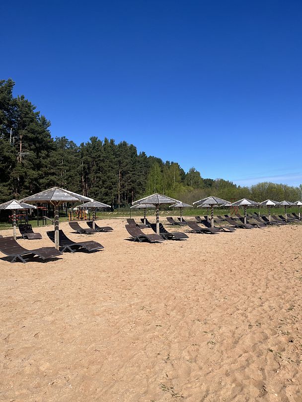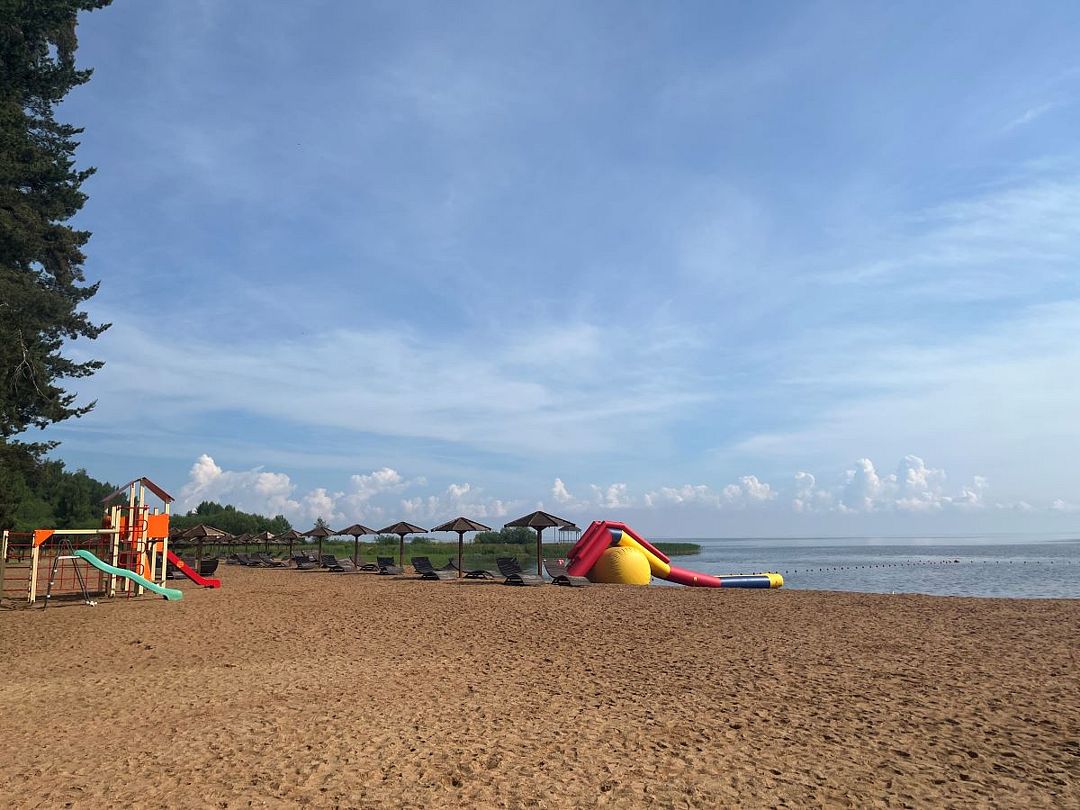 Тип пляжа: песчаныйБлагоустроенный пляж для отдыха с мелким привозным песком, протяжённостью 150 метров вдоль береговой полосы Псковского озера — крупнейшего водоёма региона. Пляж оснащён стационарными зонтиками, шезлонгами, кабинками для переодевания и пляжным душем, а в шаговой доступности находится санузел с горячей водой.
