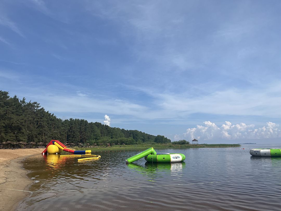 Не выбраноДостоинстваПесчаный пляж оборудован лежаками, тентами, спортплощадкой, водной горкой, качелями. Хороший вход в воду. Чистая вода. Ресторан где вкусно кормят с вменяемыми ценами. Уборка каждые два дня. Большая парковка. По выходным были караоке и душевная встреча у костра. Расстояние примерно одинаково до Пскова, Печор и Изборска. На машине 15-20 минут. Персонал вежливый. 👍
