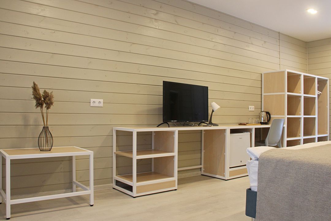 - гостиная с мини-кухней (для разогрева еды), холодильник, цифровое ТВ, овальный стол (до 10 человек) . Комплектация мини-кухни: микроволновая печь, чайник, раковина со смесителем, тарелки, чашки, стаканы, приборы, разделочная доска;