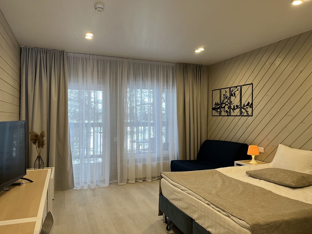 Однокомнатный номер в коттедже Твин Хаус с видом на озеро. Имеет индивидуальный вход и террасу. Предназначен для комфортного размещения двух человек. Возможно размещение на доп. месте ( в качестве дополнительного места - диван).