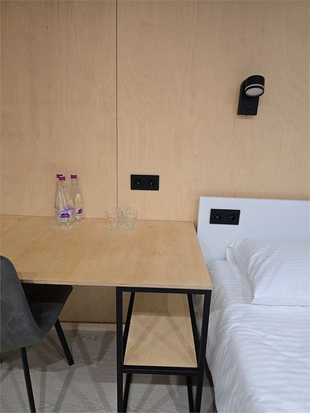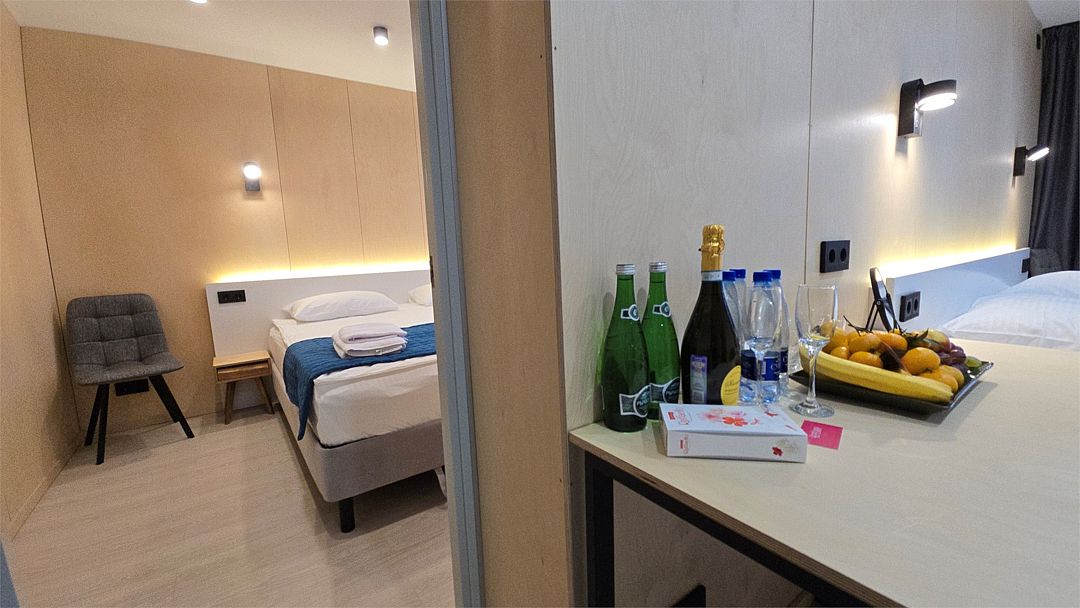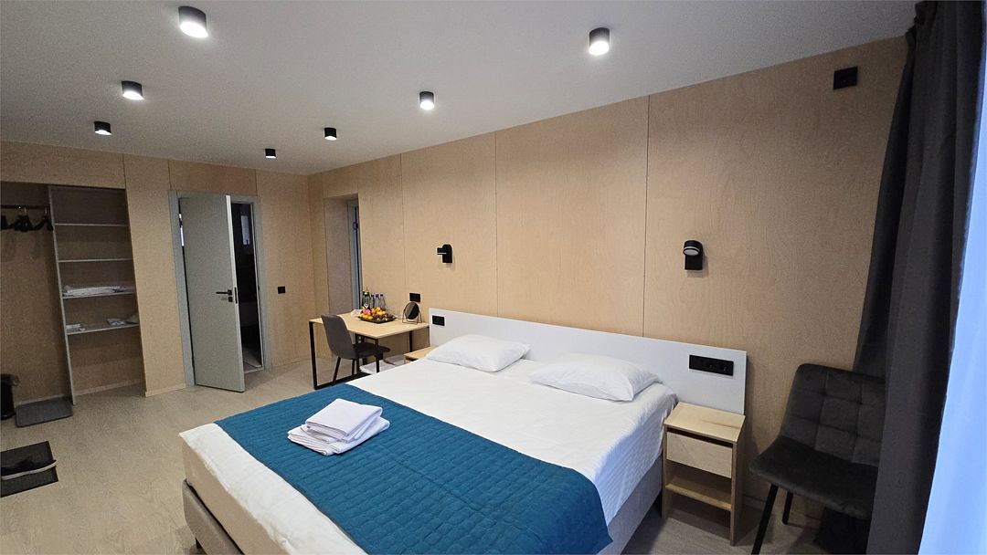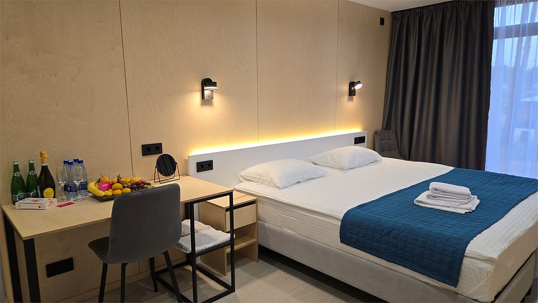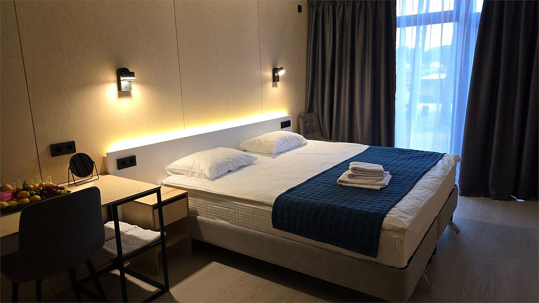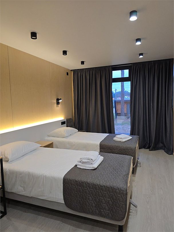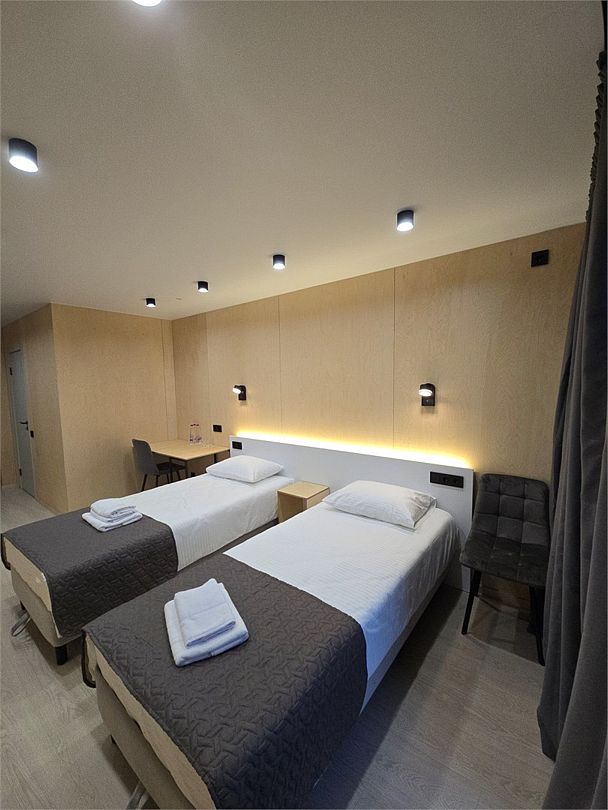 Двухместный номер, площадью 20 кв.м., имеет все необходимые удобства для комфортного проживания. Номер оборудован двумя раздельными одноместными кроватями, ванной комнатой с душевой кабиной, а также небольшой рабочей зоной. Дизайн интерьера выполнен в спокойных тонах, что создает атмосферу уюта и расслабления. Большие окна обеспечивают обилие естественного света и открывают вид на окружающую природу.Двухместный номер с двухспальной кроватью