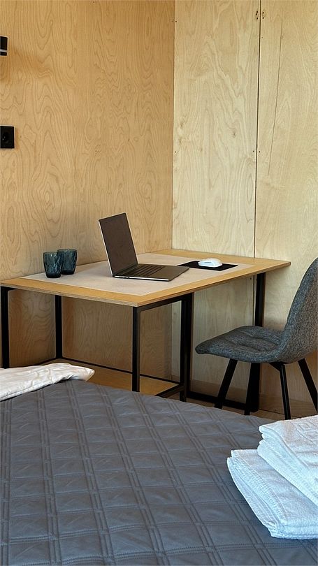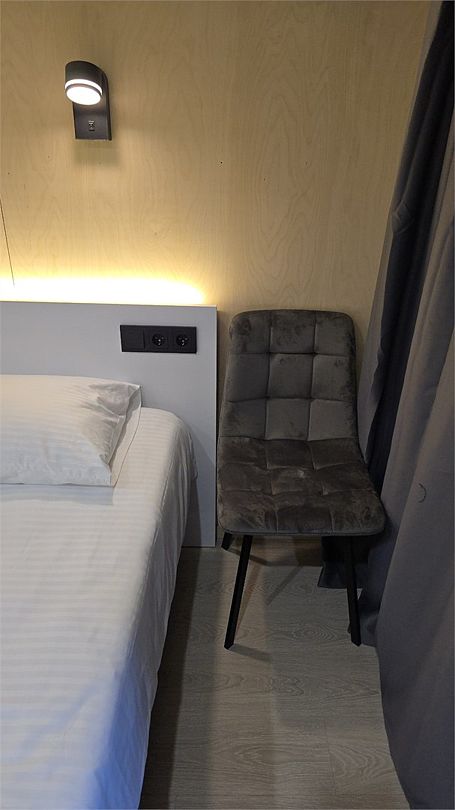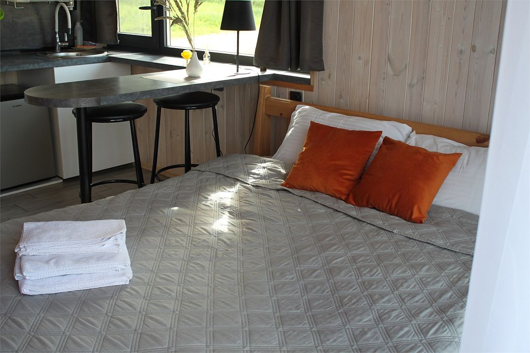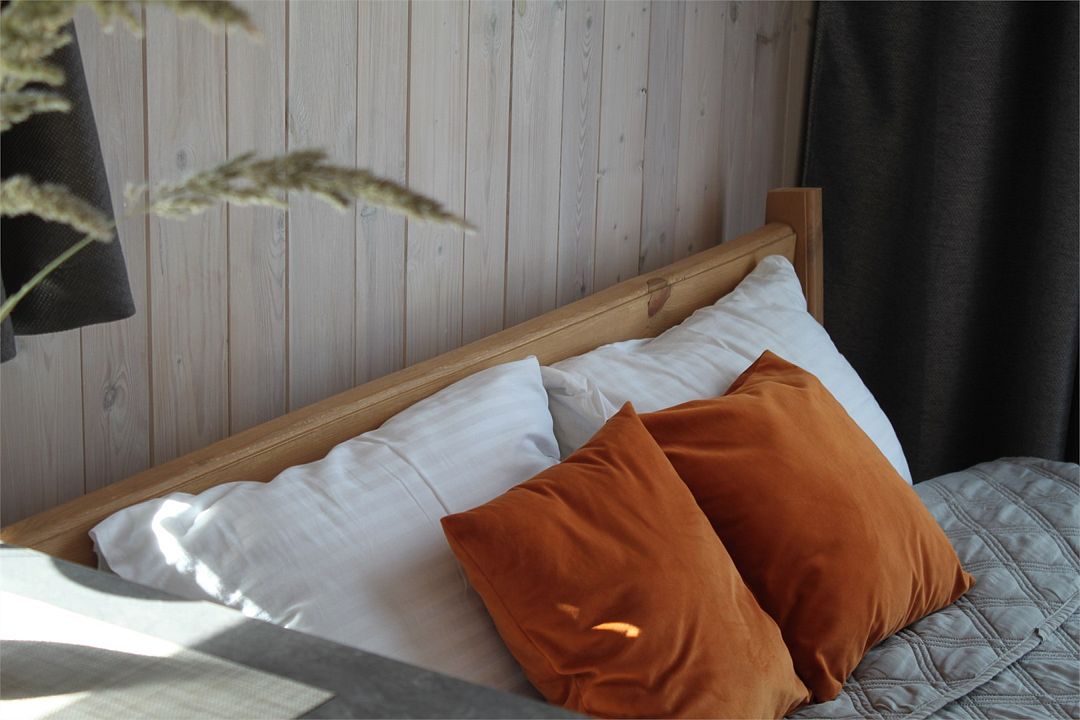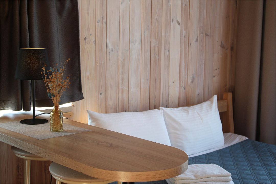 Двухместный номер площадью от 22 квадратных метров имеет все необходимые удобства для комфортного проживания. Номер оборудован кроватью размера “king-size”, ванной комнатой с душевой кабиной, а также небольшой рабочей зоной. Дизайн интерьера выполнен в спокойных тонах, что создает атмосферу уюта и расслабления. Большие окна обеспечивают обилие естественного света и открывают вид на окружающую природу.Домик в скандинавском стиле