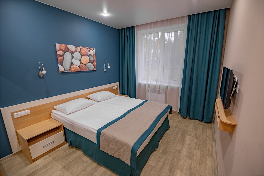 телевизор, Wi-Fi, светильник, фен, электронные замки, душевая кабина, санузел, банные полотенца, тапочки, двуспальная кровать, шкаф для одежды, вешалки, багажная тумба, зеркало, унитаз, раковина, отопление, душ, кулер на этаже, вид во двор, стаканы, внутренний телефон, шкаф-купе, вид на лес, вешалки-плечики, зеркало в полный ростВ гостиничном номере