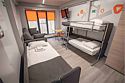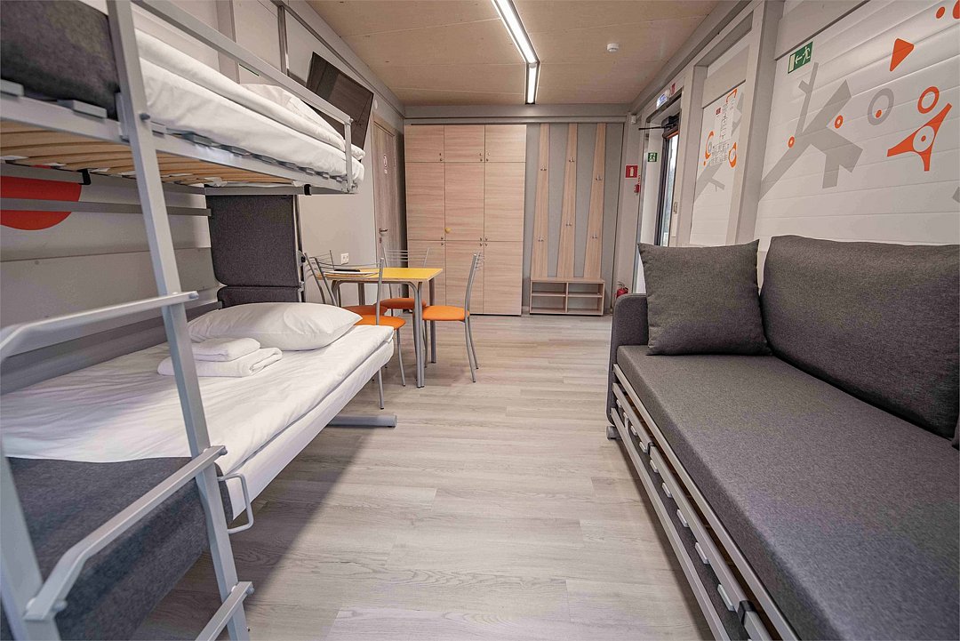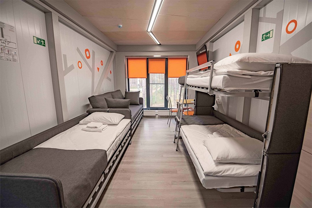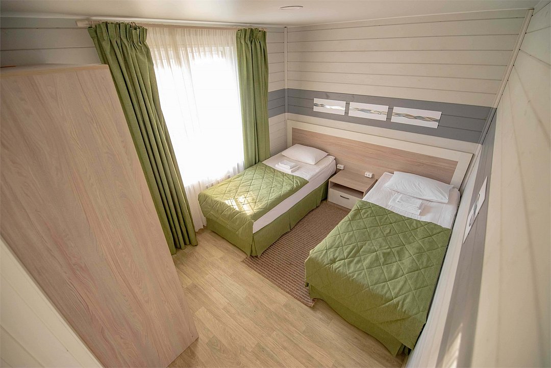 Четырехместный номер с двумя двухъярусными кроватями-трансформерами (двухъярусная кровать/одноярусная односпальная кровать/диван). Также в номере есть санузел и прилегающая терраса.Услуги и удобства