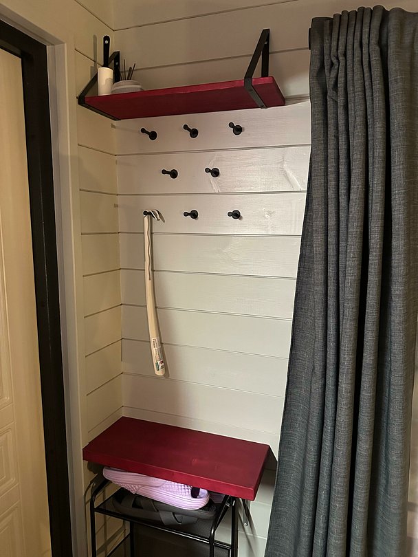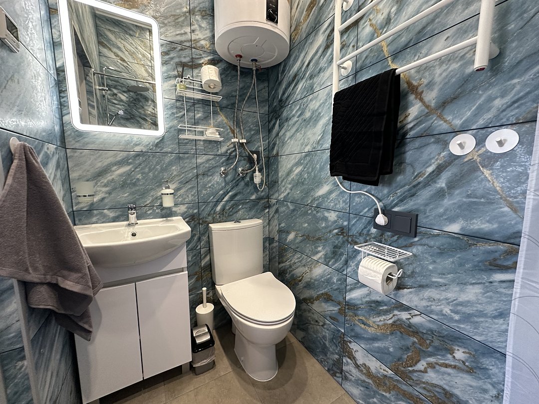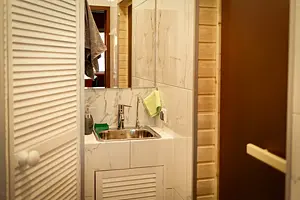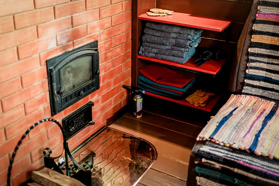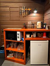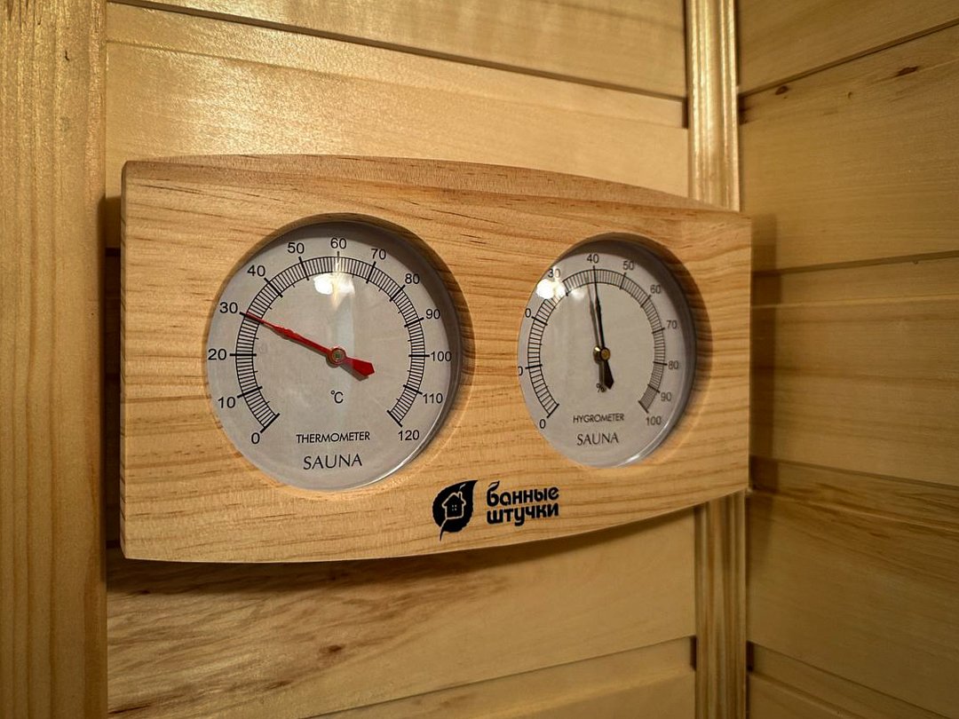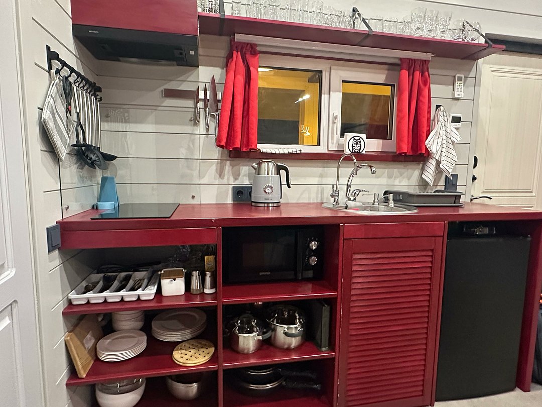 Для удобства гостей в бане есть душевая и санузел, предоставляются туалетно-косметические принадлежности, фен, микроволновая печь, холодильник, электрический чайник с чаем, доступ в интернет через Wi-Fi и Smart TV. Рядом находится мангальная зона и парковка для двух автомобилей.