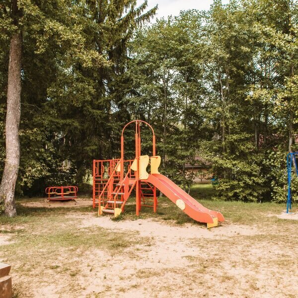 На территории базы отдыха есть несколько детских площадок. Одна из них находится прямо на пляже. Она идеальна для малышей. Здесь есть и горки, и лазалки, и карусель, и качели, и качалки). Вторая — сказочная площадка, находится в середине базы. Там стоит настоящий домик Бабы-Яги. А прогуливаясь вокруг него, вы встретите героев русских народных сказок.