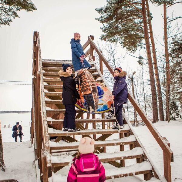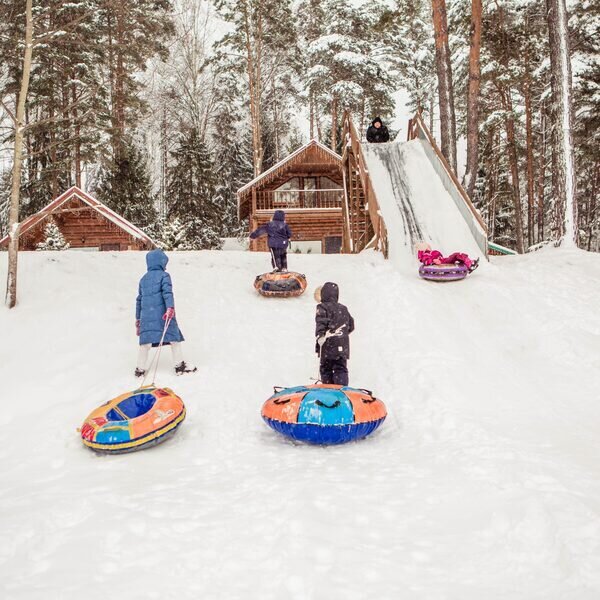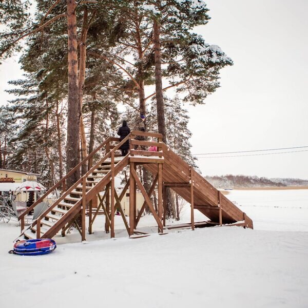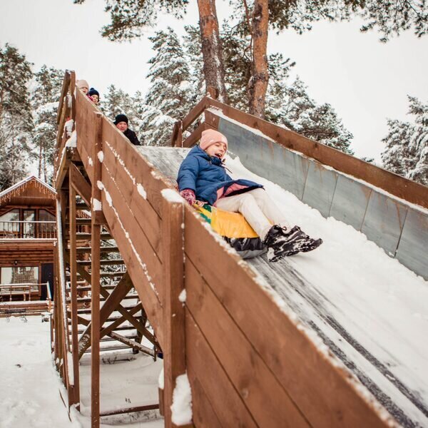 Испытайте каскад острых ощущений, скатившись с 4-х метровой деревянной горки. Длина трассы около 50 м. Ватрушки и санки можно взять напрокат.