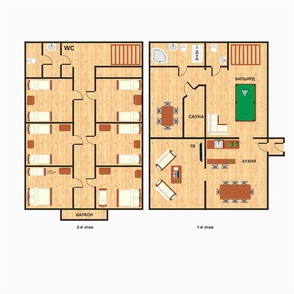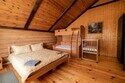 На 2 этаже расположены три спальни: одна с двуспальной и односпальной кроватями, одна с двумя односпальными и одна с одной односпальной кроватью, а также просторный балкон с уличной мебелью и прекрасным видом на озеро. Мангальная зона у каждого коттеджа.