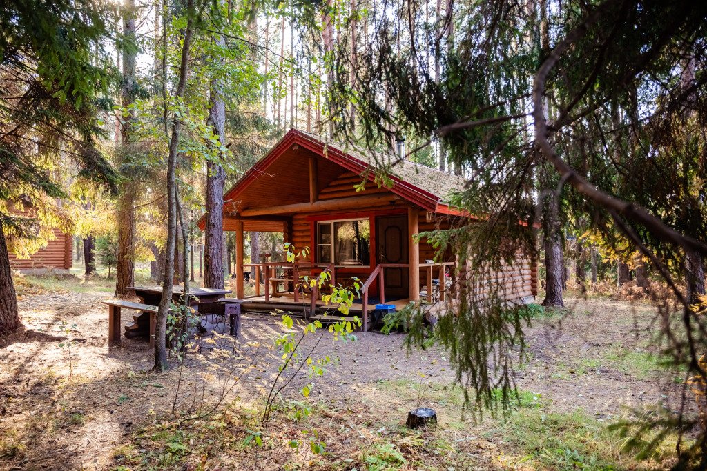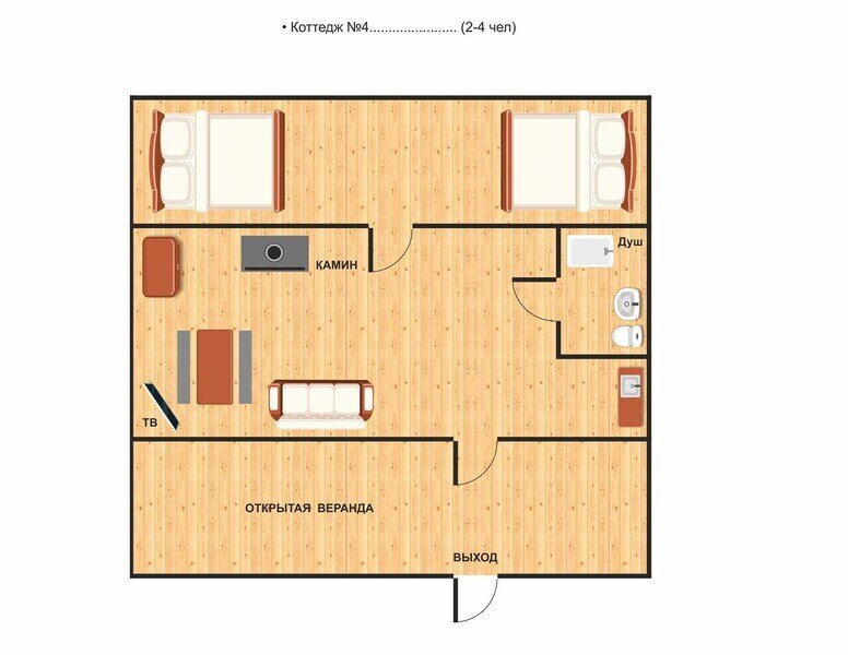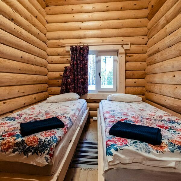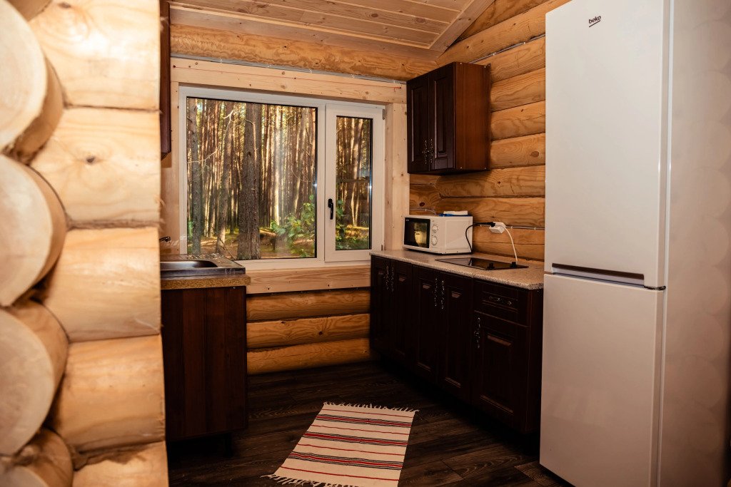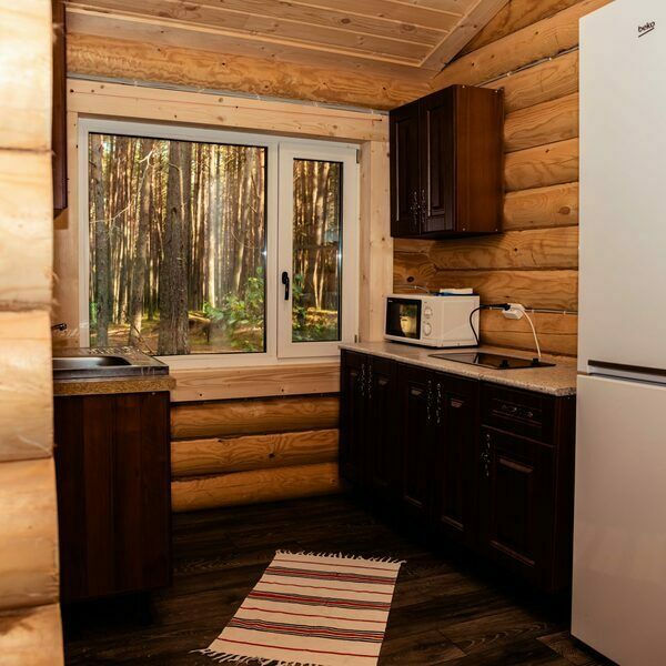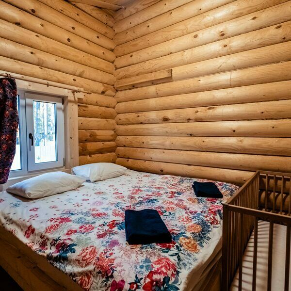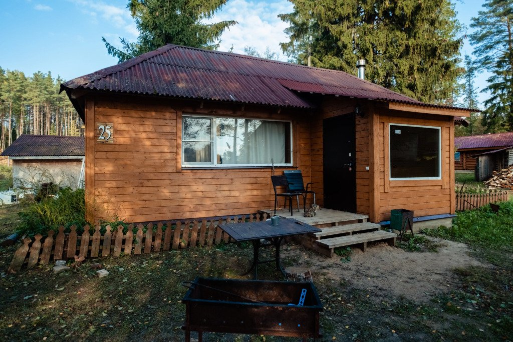 Уютный деревянный коттедж на 4 человека, расположенный в лесной зоне, подойдет для комфортного проживания семьи с детьми. В коттедже расположены гостиная с обеденным столом, кухонная зона, две спальни (одна с двуспальной кроватью, вторая с двумя односпальными), санузел с душевой кабиной и терраса с уличной мебелью.