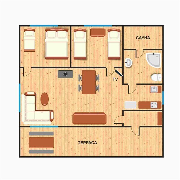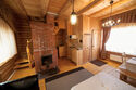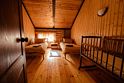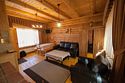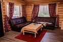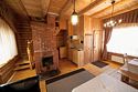 Деревянный коттедж, общей площадью 25 кв.м., расположенный на первой линии, подойдет для комфортного проживания семьи с детьми. В коттедже расположены гостиная с удобным диваном, обеденным столом и камином, кухонная зона, спальня с двумя двуспальными кроватями, сан. узел, терраса с уличной мебелью.