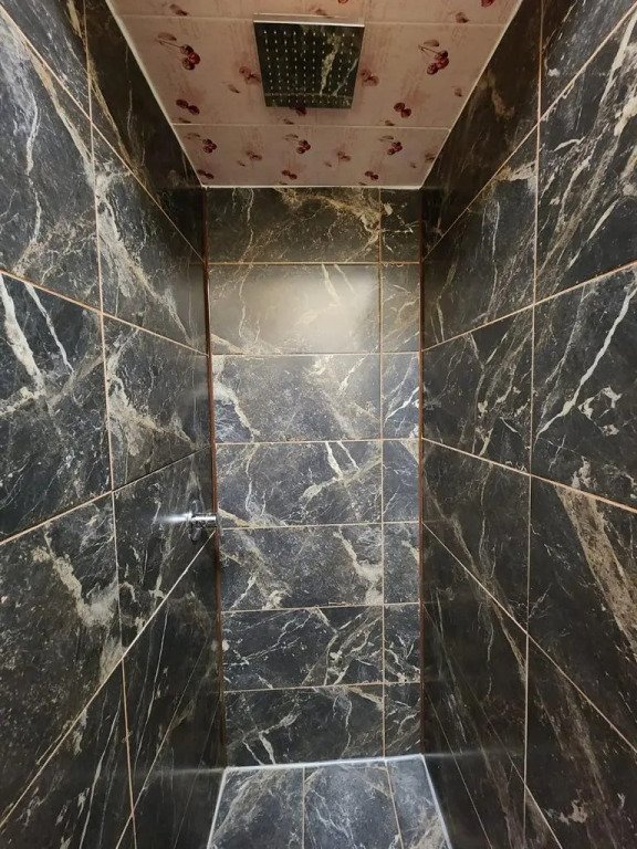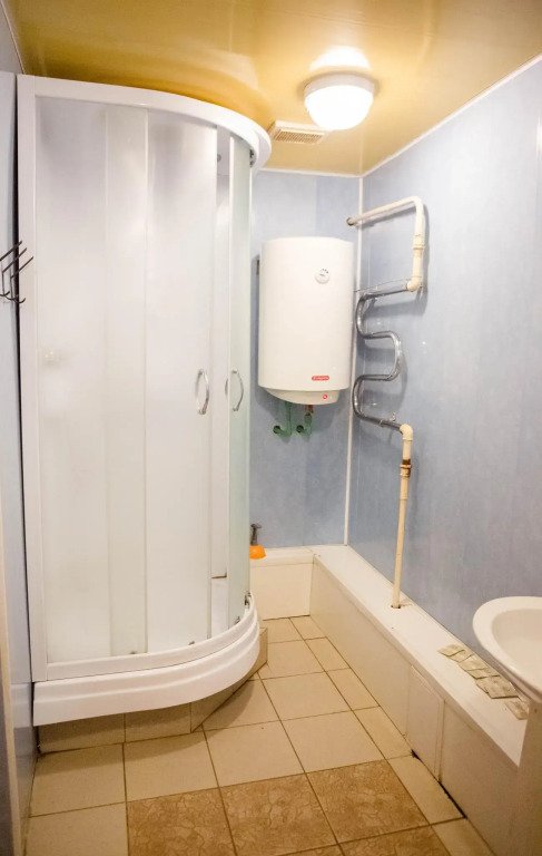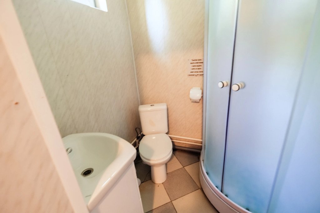Сан. узел. (два туалета, два душа) на этаже. Общая кухня с электроплиткой, холодильником и электрочайником. Посуда отсутствует.