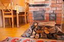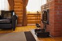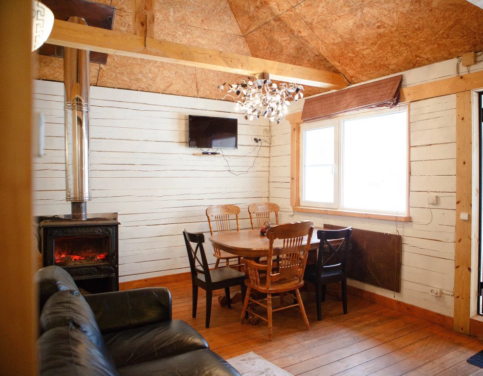 В коттедже на 1 этаже расположены гостиная с удобным разбирающимся диваном, журнальным столиком и камином, обеденный стол, кухонная зона, сан. узел, терраса с уличной мебелью.