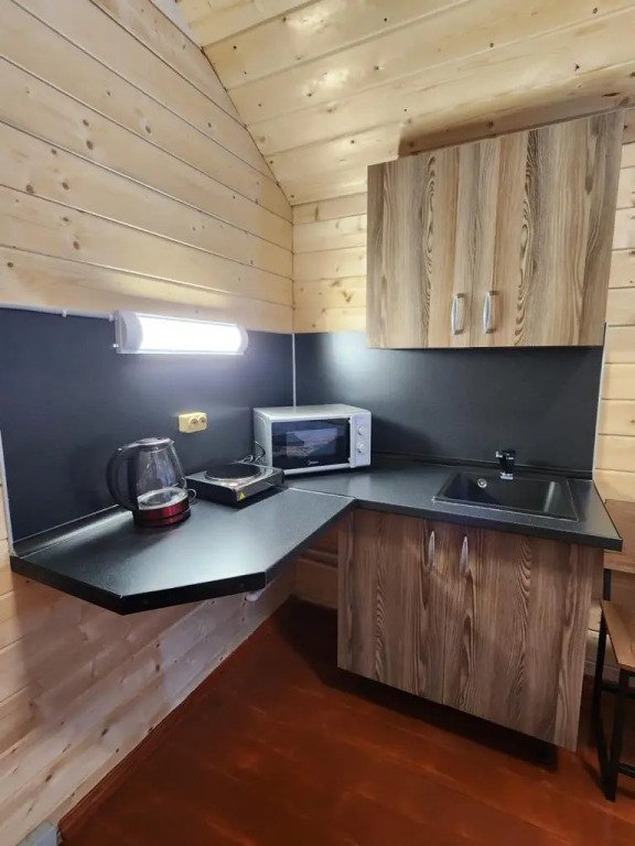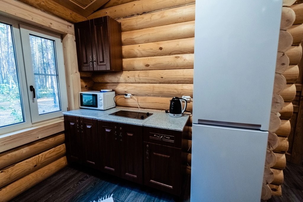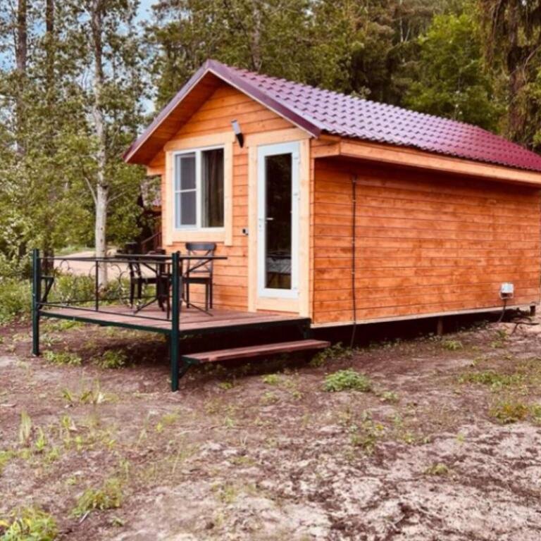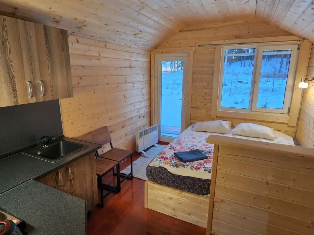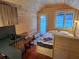 Деревянные коттеджи-студии, общей площадью 18 кв.м., подойдут для комфортного проживания двух человек. В коттедже расположены широкая двуспальная кровать, кухонная зона, обеденный стол, сан. узел с душевой кабиной.