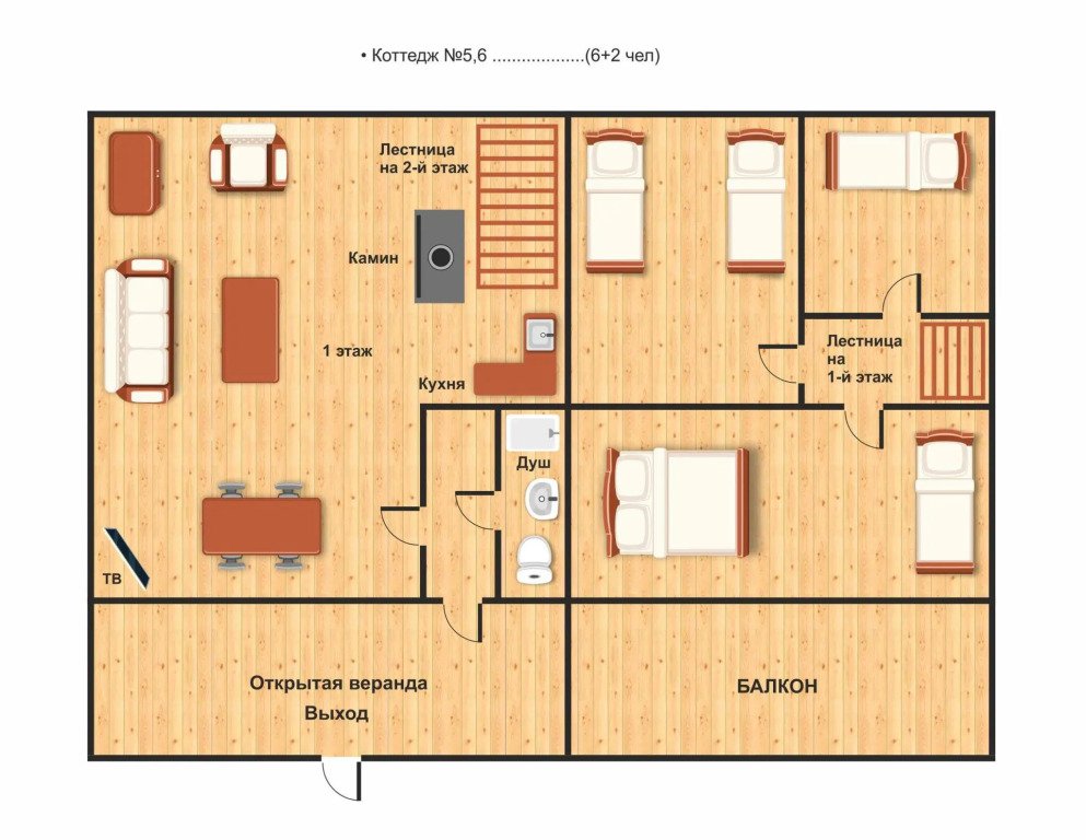 56 м2 · 6-и местный дом + 2 доп. места