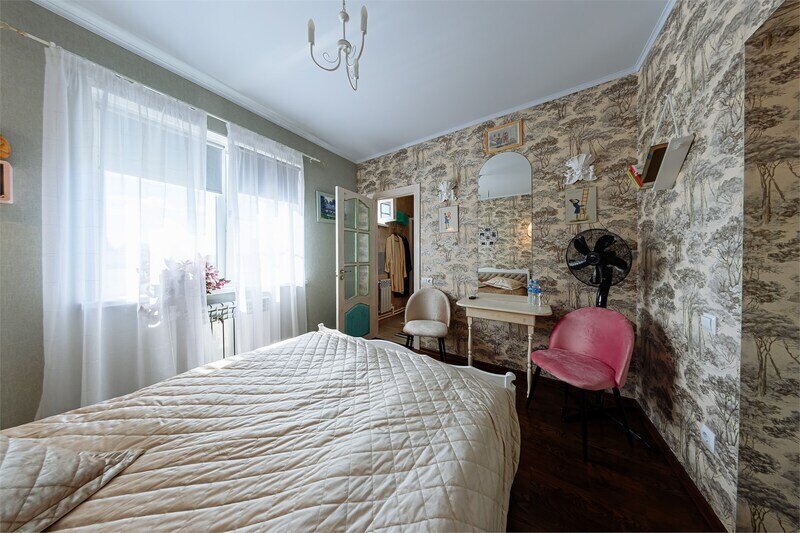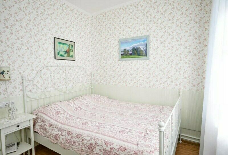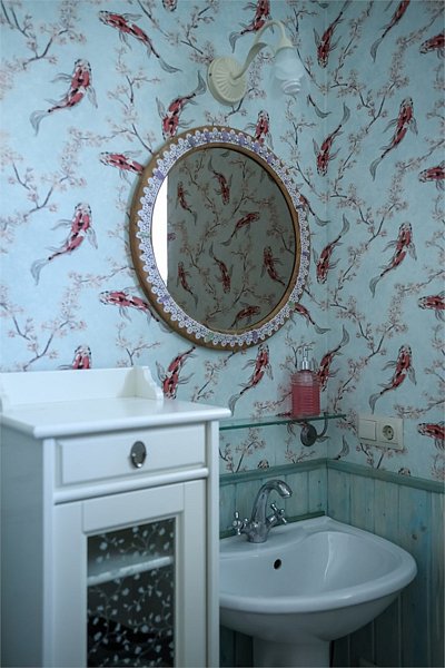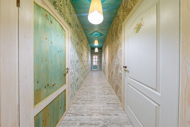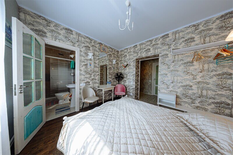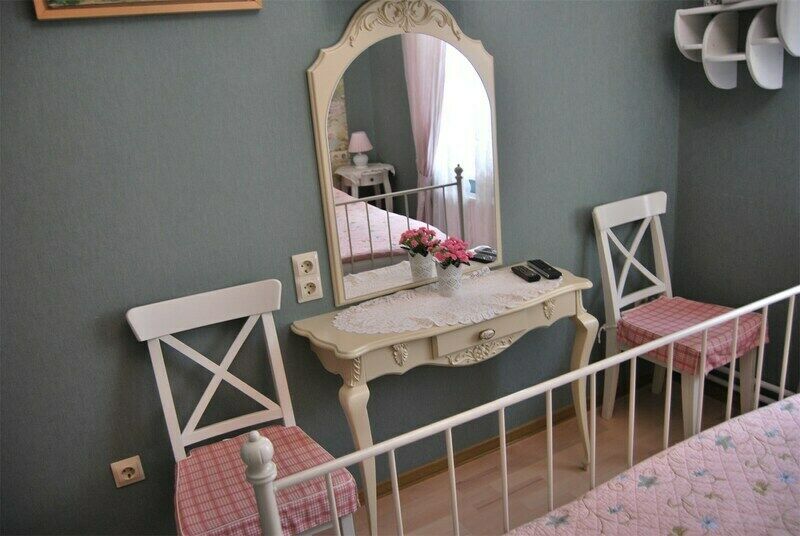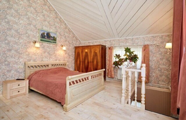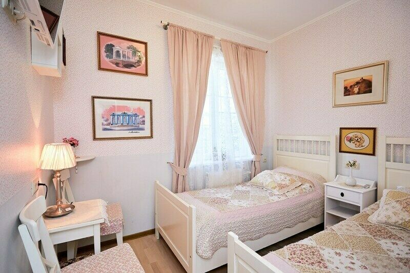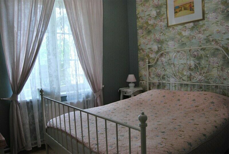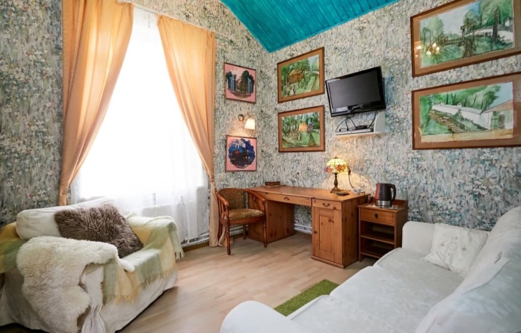 Дизайн помещений выдержан в милом мещанском стиле дворянских имений времен Пушкина. Цветочные обои, обои с зимнем пейзажем, статуэточки, картины, кружева, оборочки, цветные одеяла, множество милых вещиц составляют уютную душевную атмосферу этого места.
