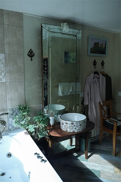 - помимо этого номера мы могли сидеть в гостиной с камином (я могу ошибаться, но мне кажется, мы могли попросить разжечь его - там были дрова), могли в комнате-библиотеке, могли в беседке на улице, могли в красивейшей веранде. То есть это действительно дом со множеством помещений, где можно отдыхать, а не просто маленькая студия за Х в сутки. Кстати, для туристов, которые не готовы кушать только в ресторанах - есть мини-кухня с холодильником, микроволновкой и чайником. Можно пользоваться и готовить самим, но в усадьбе тоже можно обедать.