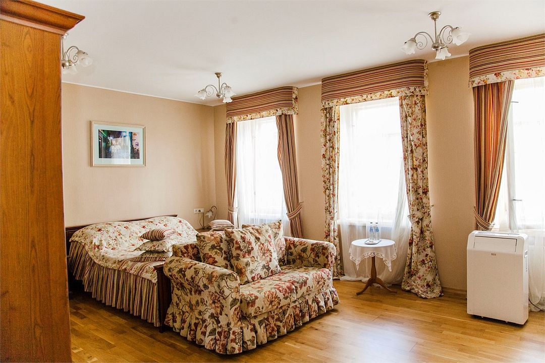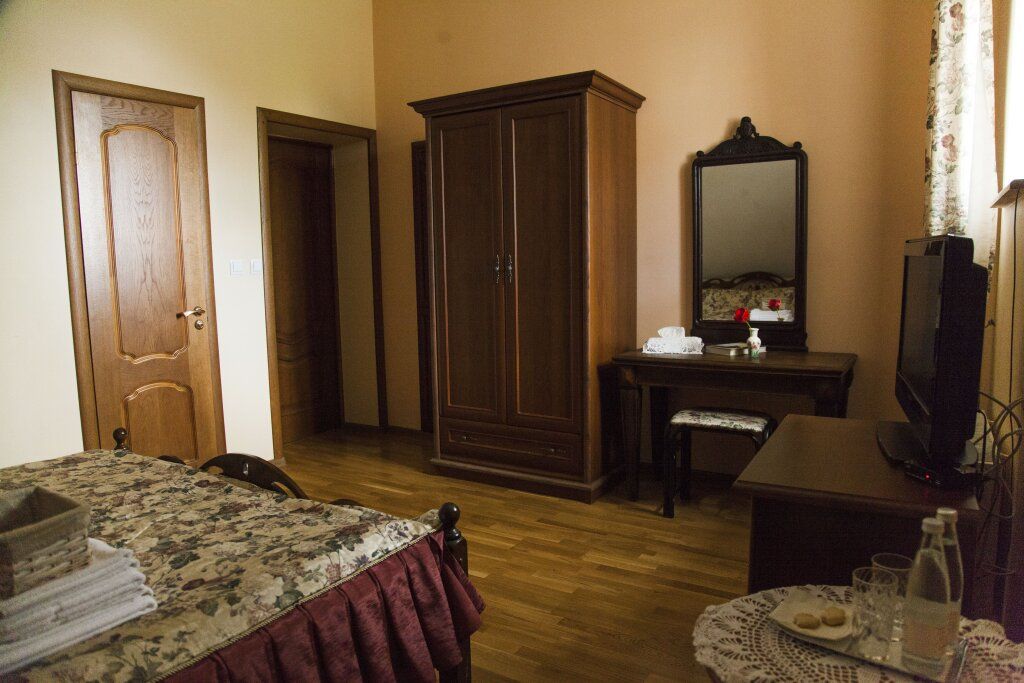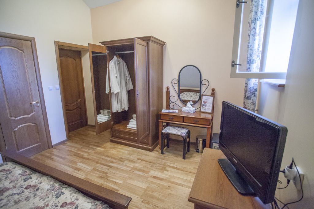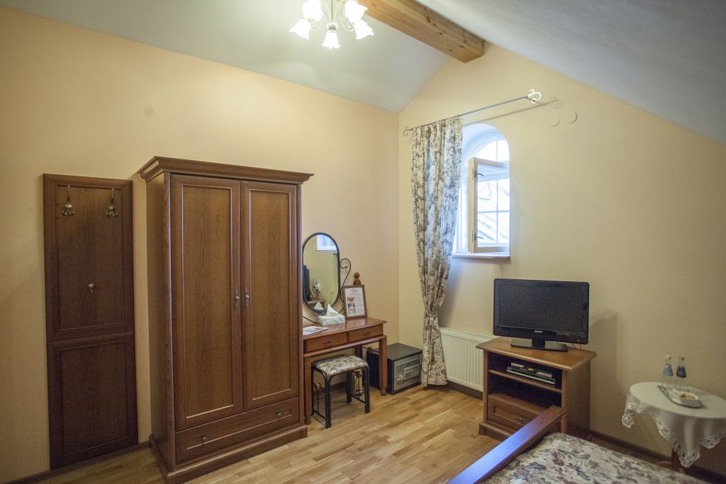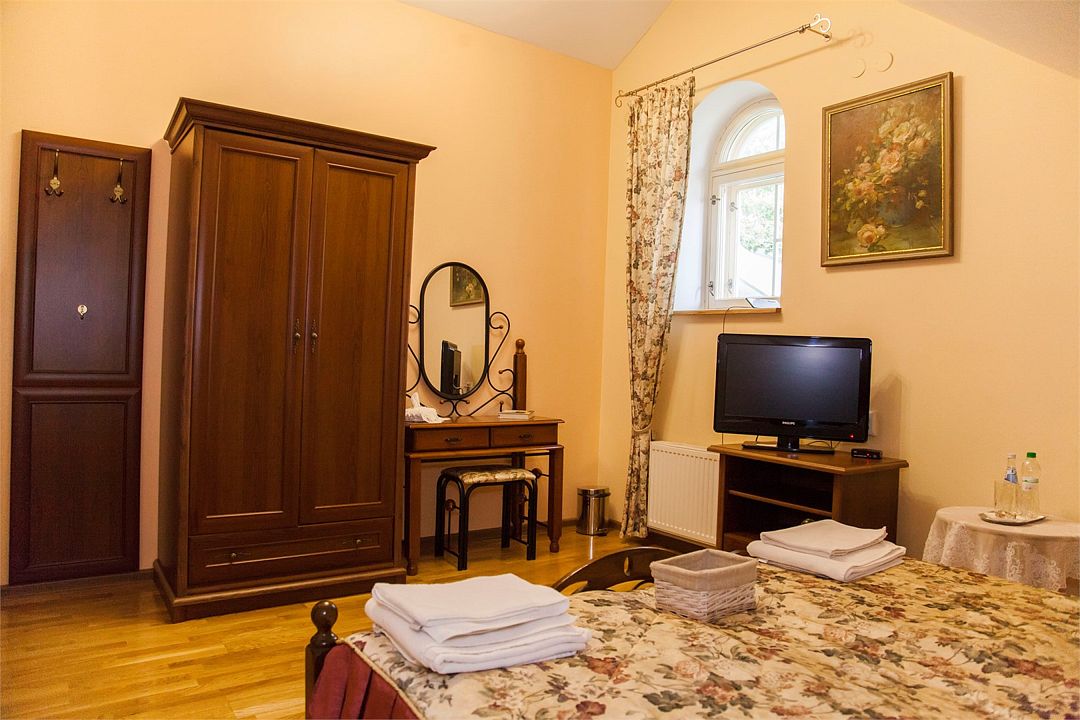 Комната расположена на втором этаже гостевого дома, с видом на Мирожский монастырь, площадь комнаты более 30 квадратных метров.