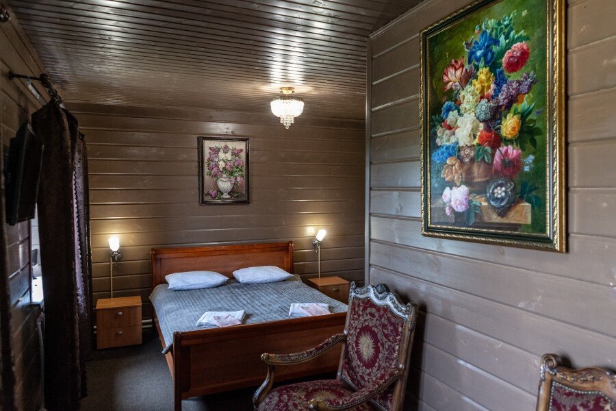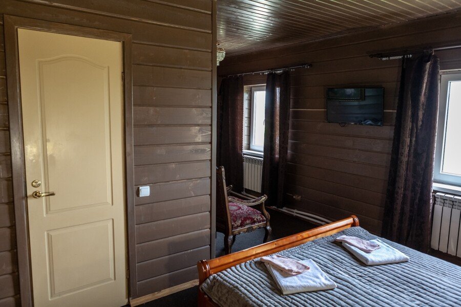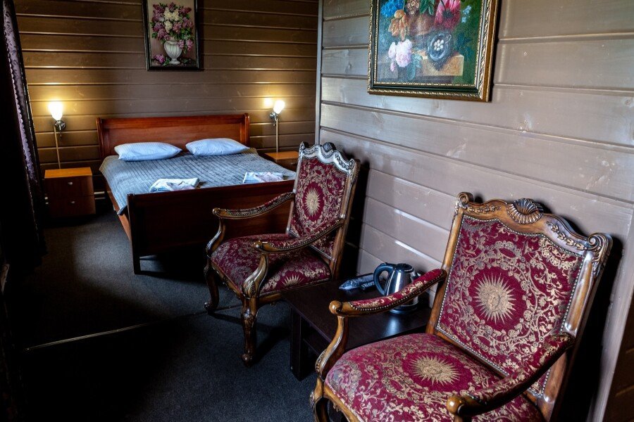 Уютный номер для двоих , площадь 24м. кв. В номере есть кровать размером 1.6 м. , чайник , мини холодильник, телевизор , два кресла и журнальный столик , душ и санузел, шторы блэкаут.