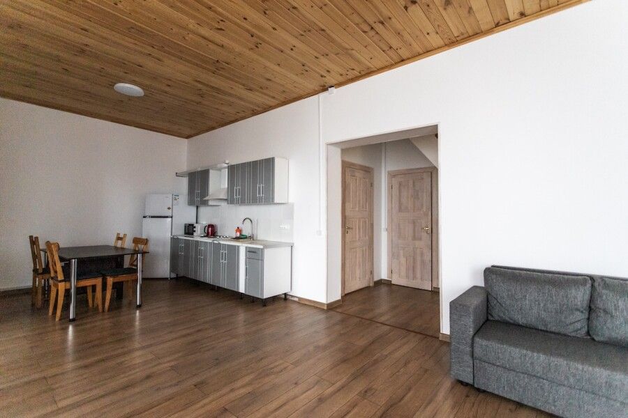 Кухня оснащена электрической варочной панелью, холодильником, микроволновой печью и чайником. В гостиной есть выход на открытую террасу, где вы можете наслаждаться свежим воздухом и видами на природу.