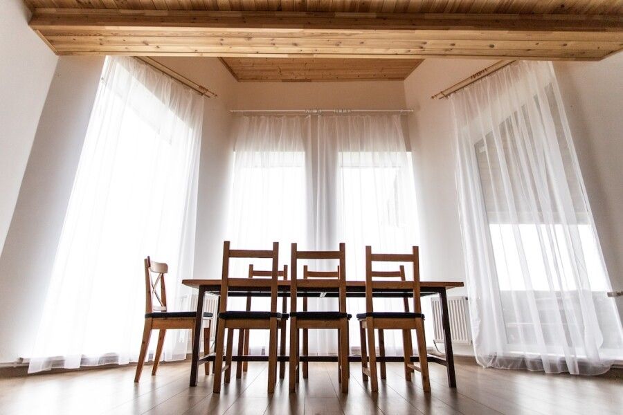 - Просторная гостиная с панорамными окнами, где есть большой диван и стол, идеально подходящие для вечерних посиделок и отдыха.