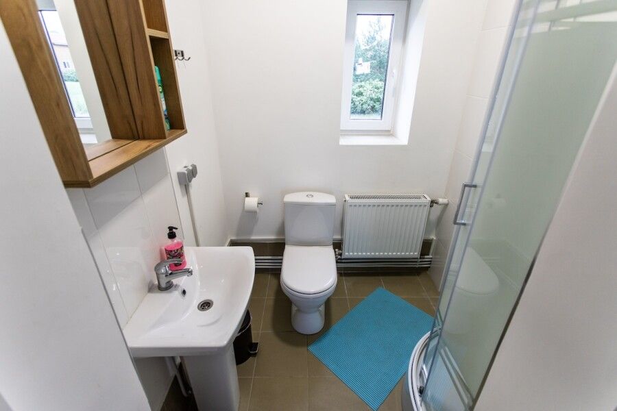 Два санузла, один на первом и один на втором этаже, оборудованных душевыми кабинами, раковинами и унитазами для удобства гостей. Совмещенная кухня и гостиная на первом этаже, где вы можете готовить вкусные блюда и проводить время в приятной компании.
