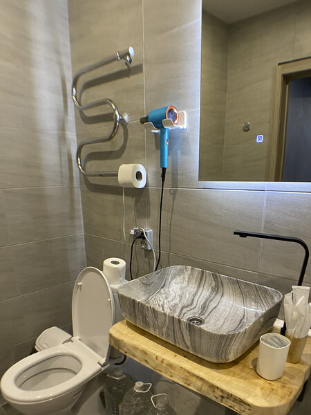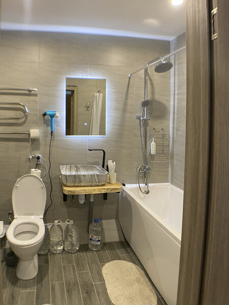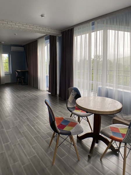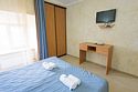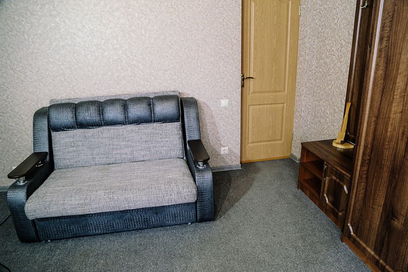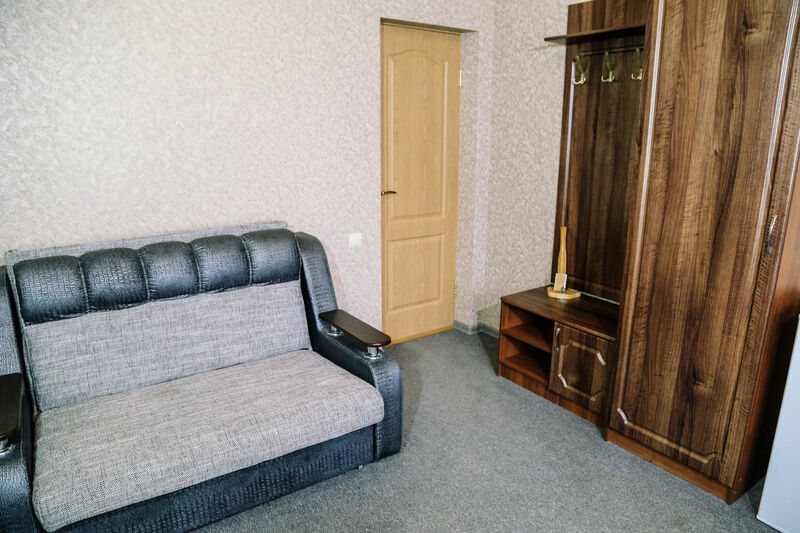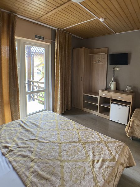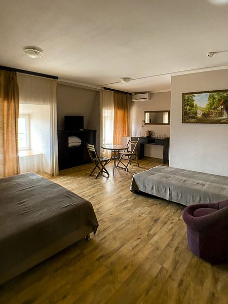 Уютный номер для 3 взрослых и 2 детей, категории стандарт. Располагается номер на 3м этаже. Каждый номер имеет: душ/туалет, телевизор, холодильник, чайник, фен, сплит система. 1 двуспальная кровать, диван раскладной на 2 спальных места и односпальная кровать. Предоставляются душевые, туалетные, постельные принадлежности.