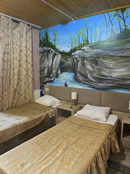 Уютный номер на 2х, категории стандарт. В номере есть: душ/туалет, телевизор, 2 односпальных кровати или 1 двуспальная кровать (топер). Предоставляются душевые, туалетные, постельные принадлежности. Холодильник, чайник, фен, в некоторых номерах сплит система.