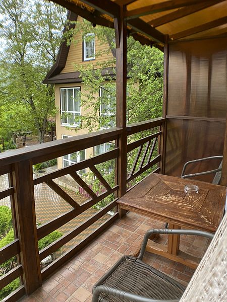 Уютный номер на 2х, категории стандарт. В номере есть: душ/туалет, телевизор, холодильник, чайник, фен, сплит система. 2 односпальных кровати или 1 двуспальная кровать (топер). Выход на индивидуальный балкон с видом на реку.