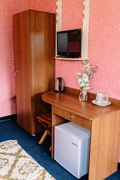 Уютный номер на 3х, категории стандарт. В номере есть: душ/туалет, телевизор, холодильник, чайник, фен, 2 односпальных кровати или 1 двуспальная кровать (топер) и диван раскладной. Предоставляются душевые, туалетные, постельные принадлежности.