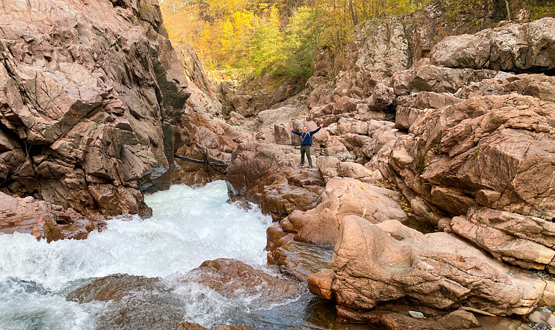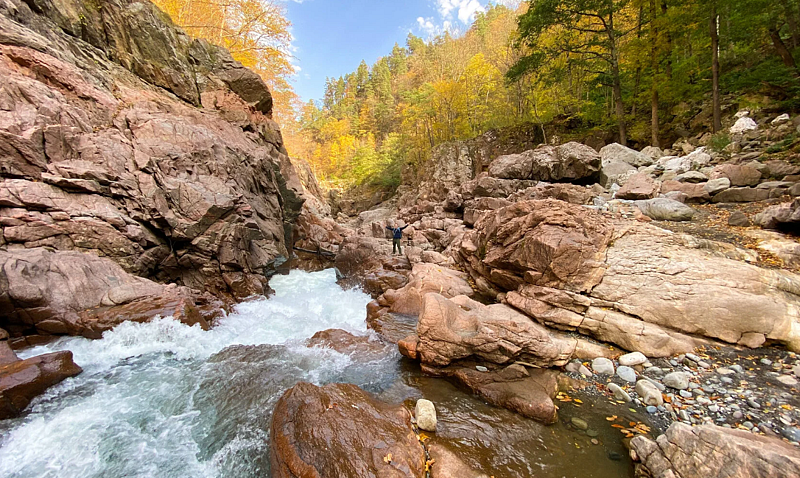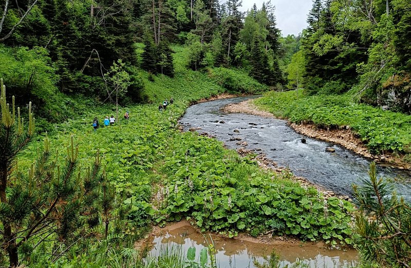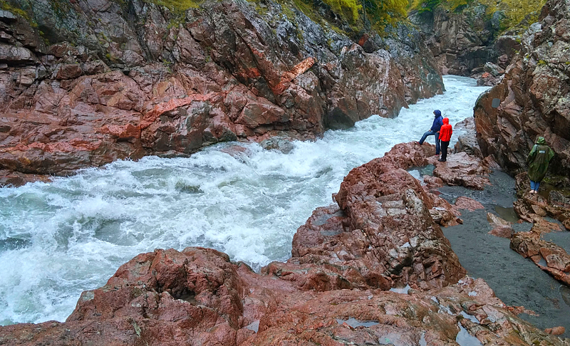 День 5. На вездеходе с открытым кузовом движемся по старому лесному волоку, эта фронтовая дорога пролегает через пихтовый бор – это уже само по себе здорово. Наша первая цель – пройти по каньону от водопада Университетского к Чинарскому.