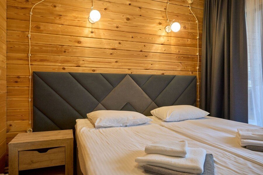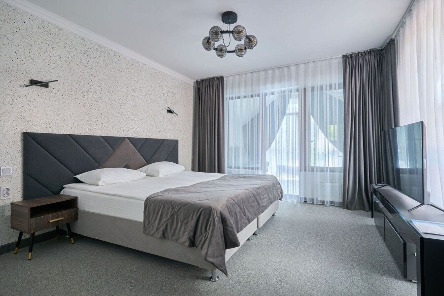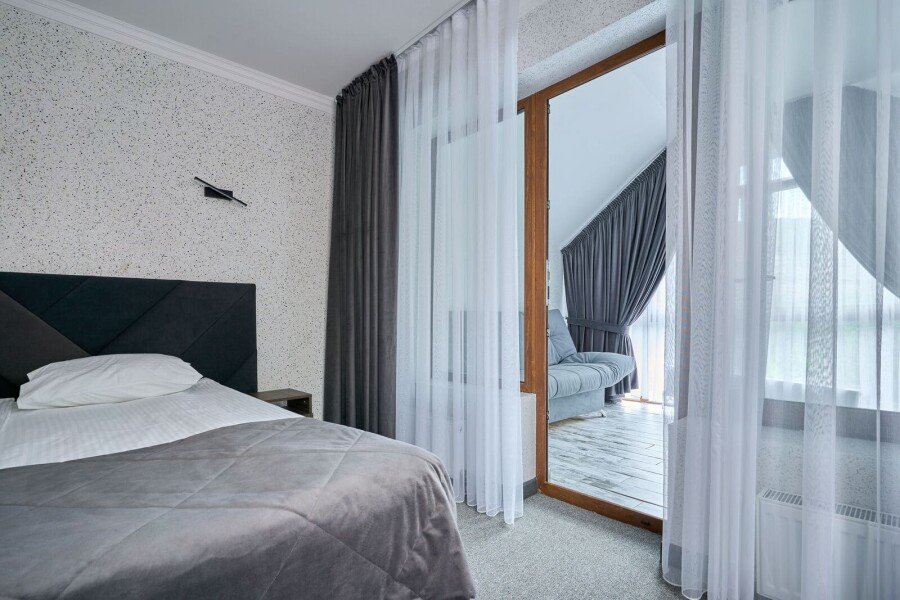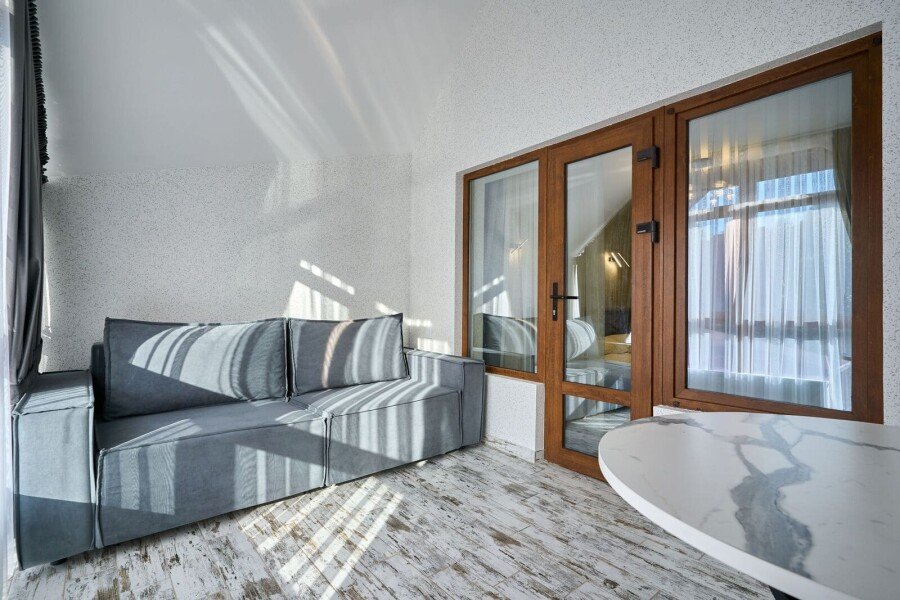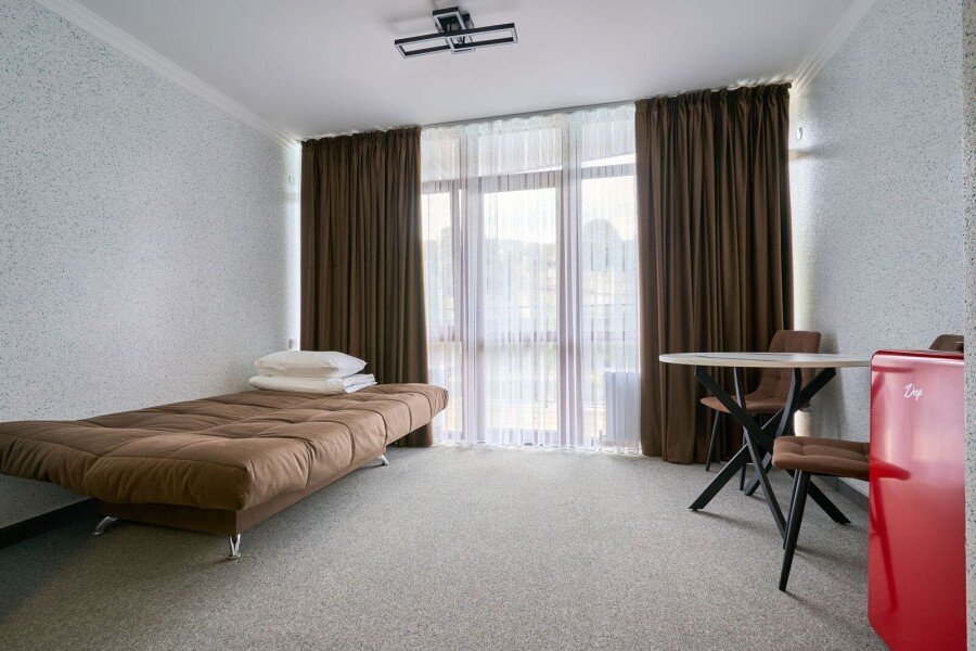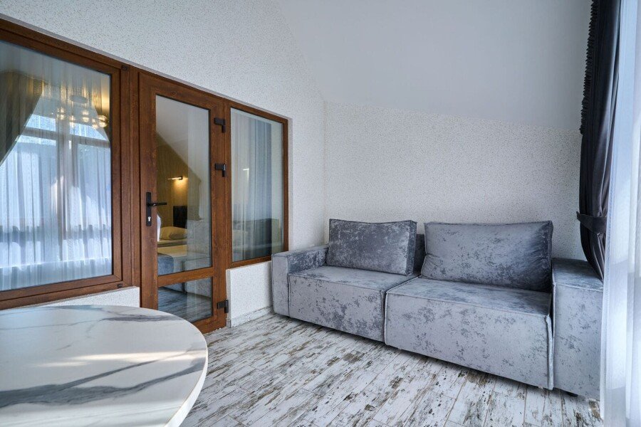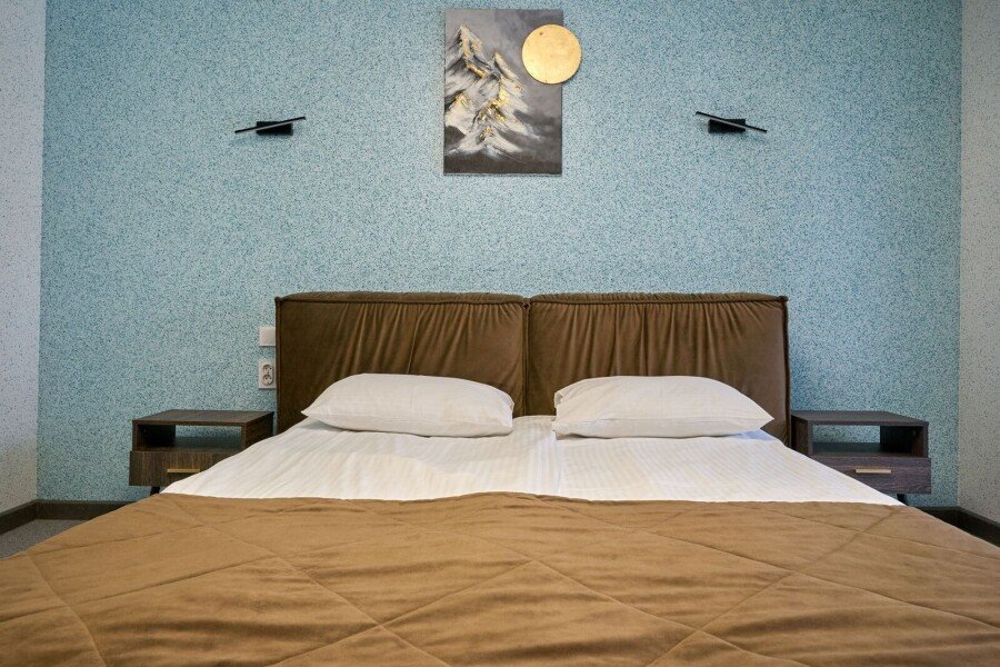 Номер категории «Комфорт» с двумя комнатами влюбляет с момента открытия двери. Спальное место представлено большой кроватью или с двумя кроватями на выбор в одной комнате, а также диваном-кроватью с ортопедическим основанием в другой комнате.