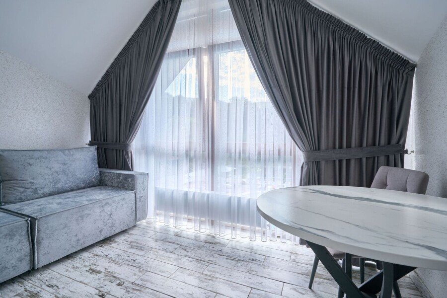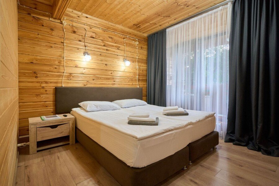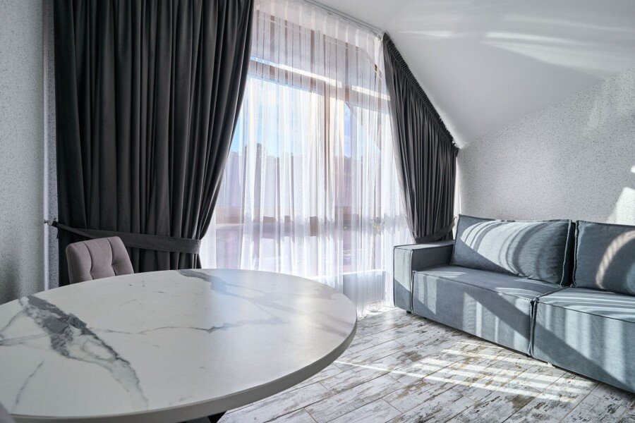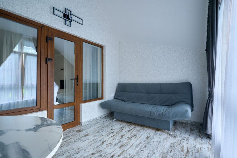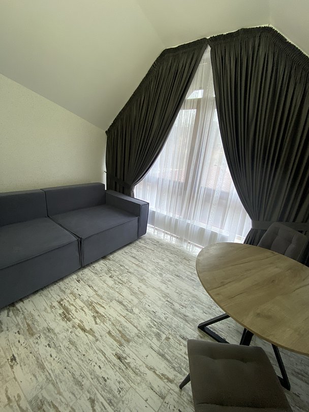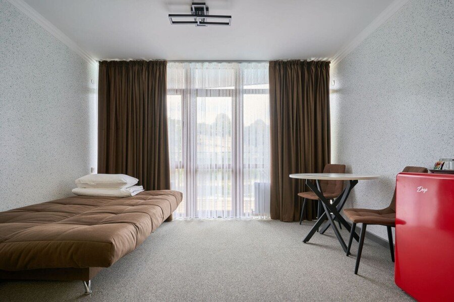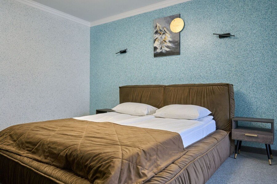 Номер категории «Комфорт» с двумя комнатами влюбляет с момента открытия двери. Спальное место представлено большой кроватью или с двумя кроватями на выбор в одной комнате, а также диваном-кроватью с ортопедическим основанием в другой комнате.
