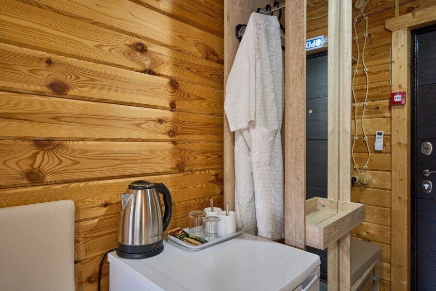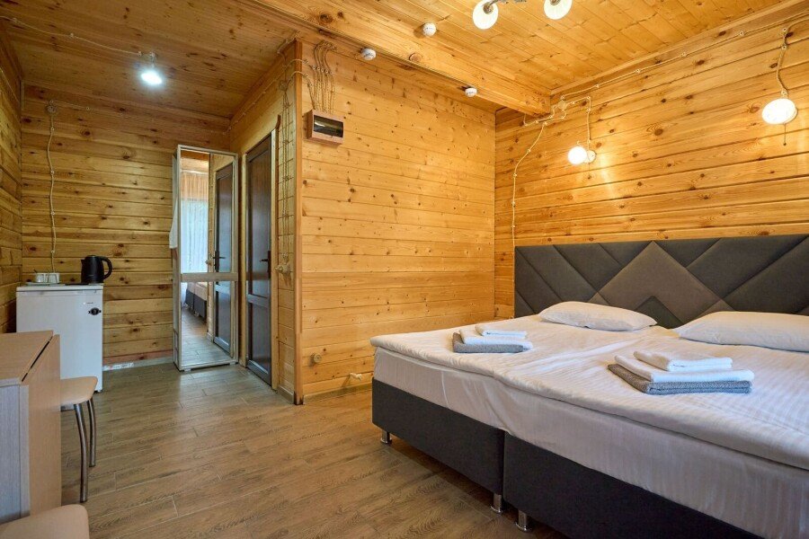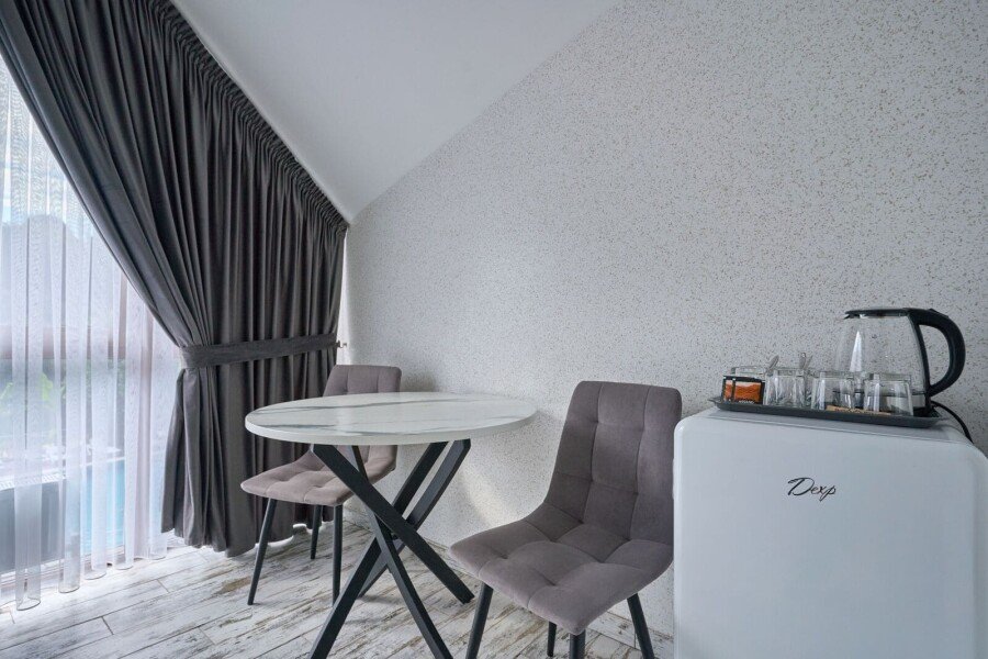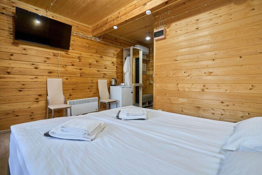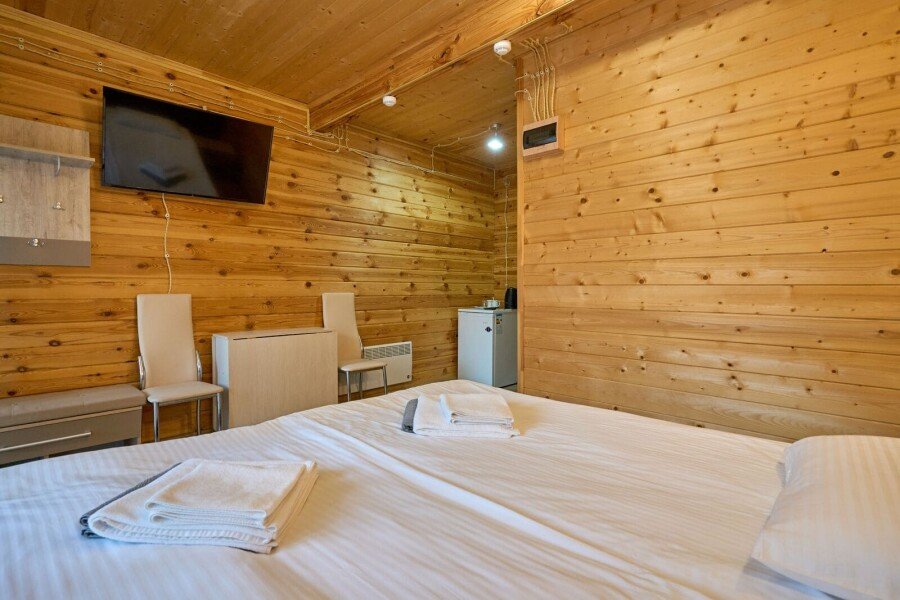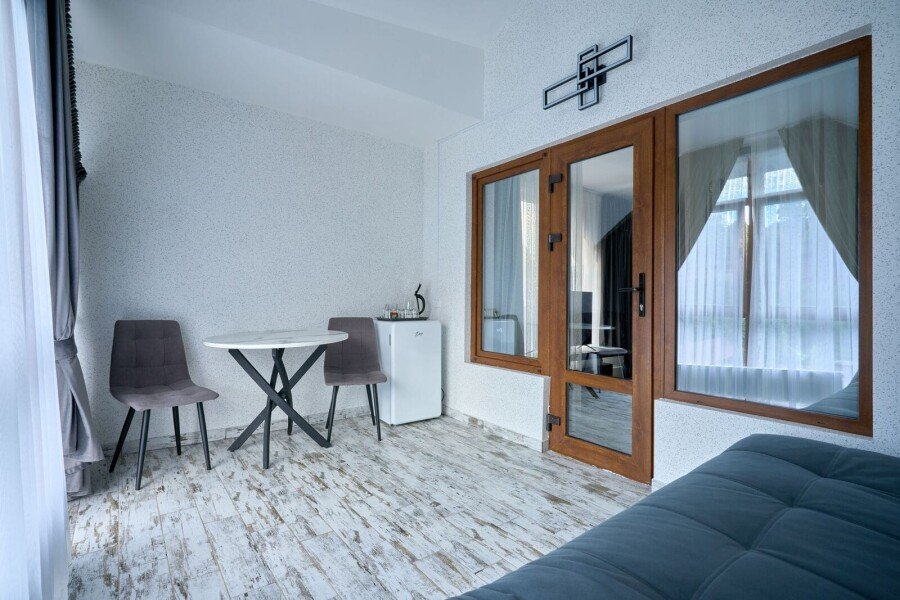 Номер состоит из спальной, ванной комнаты и балкона. В номере есть телевизор, стол, пуфик и прикроватные тумбочки. Ванная комната с раковиной и душем, также имеются индивидуальные наборы косметических средств для гостей. Стол, два стула, чайный набор, мини-холодильник. Отопление. Комфортную температуру в летнее время обеспечивает сплит система в номерах на втором этаже.