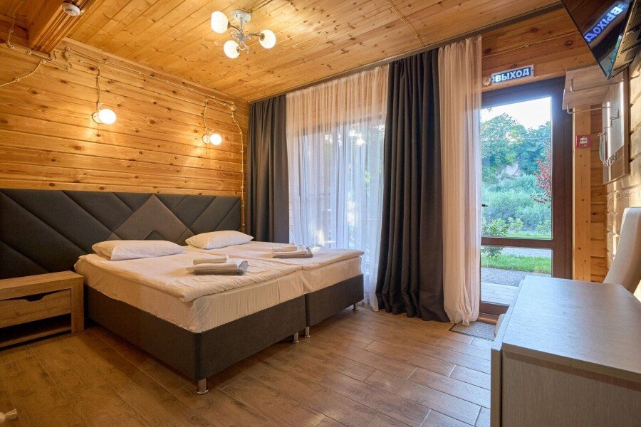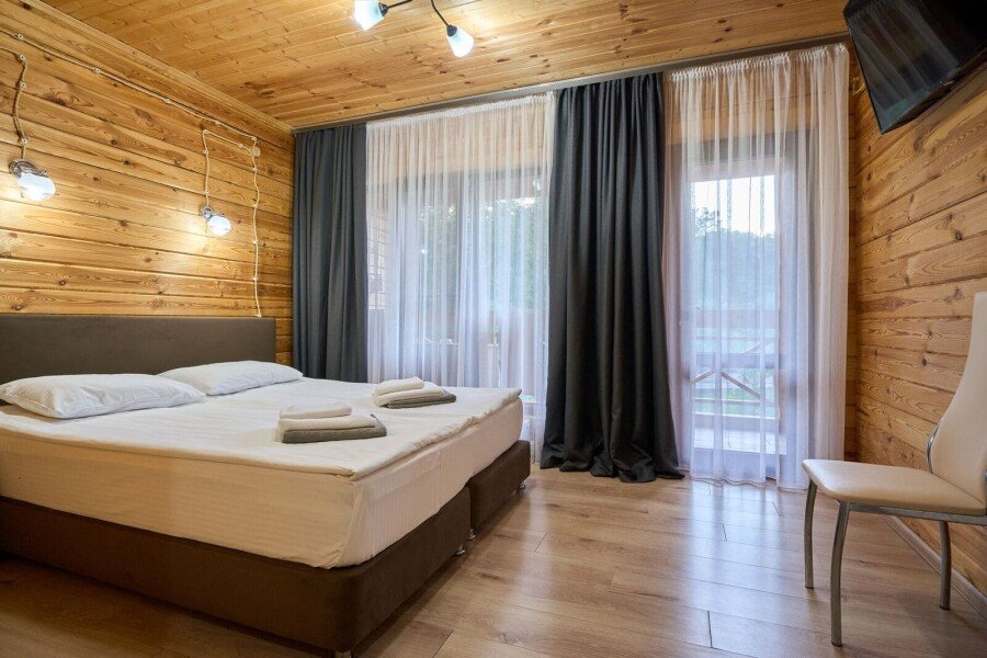 Просторный номер c панорамным видом на реку Белая», вместимостью до 4х человек. Имеется выход на открытый балкон.