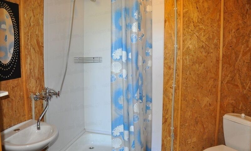 В номере: односпальные кровати, диван, санузел, телевизор. Выход на террасу, на которой стоит стол с мангалом.
