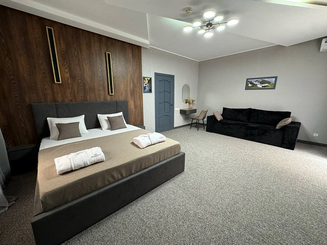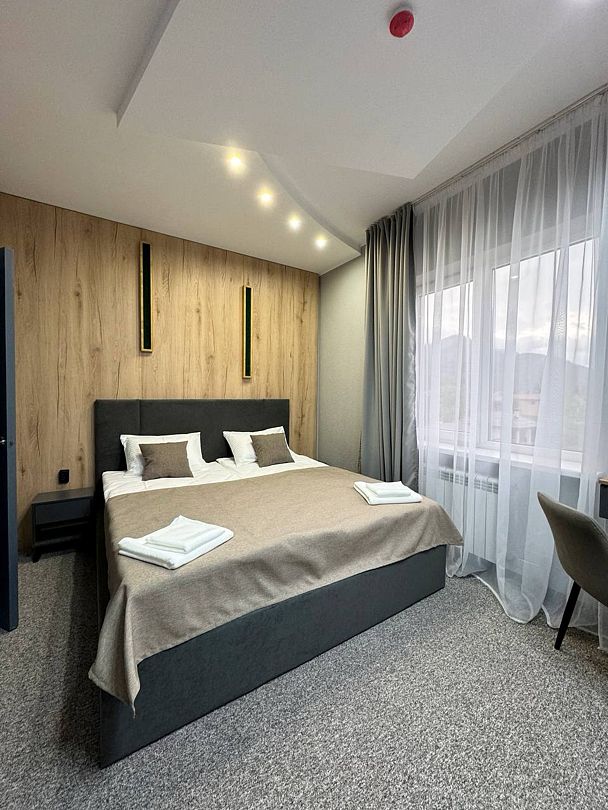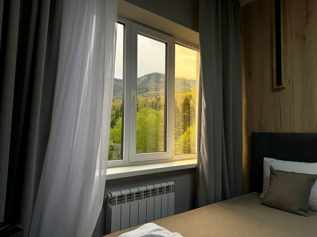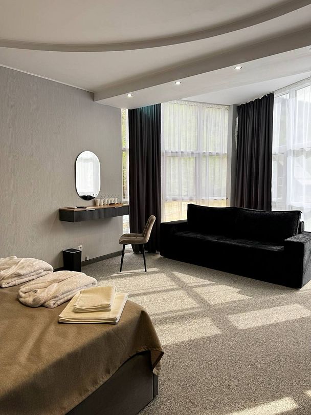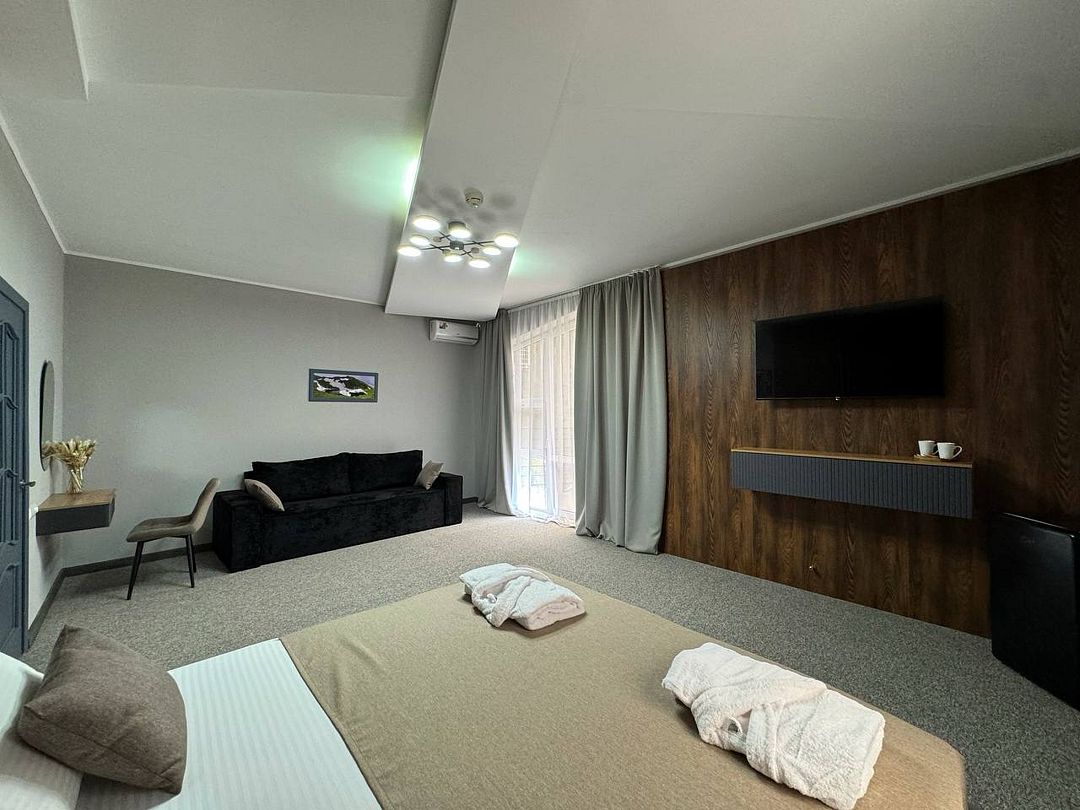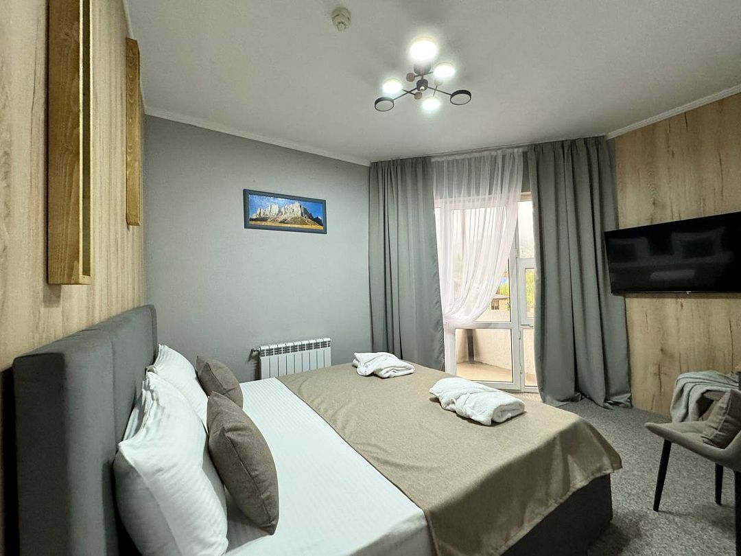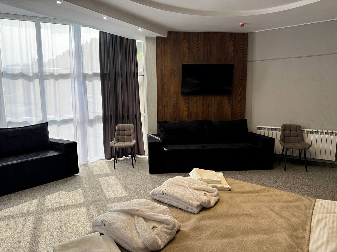 Двухкомнатный номер категории полулюкс 35 кв м с панорамными окнами, балконом и видом на горы расположен на 3-ем этаже.