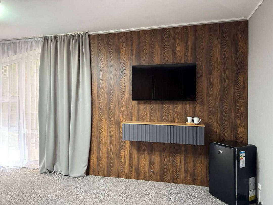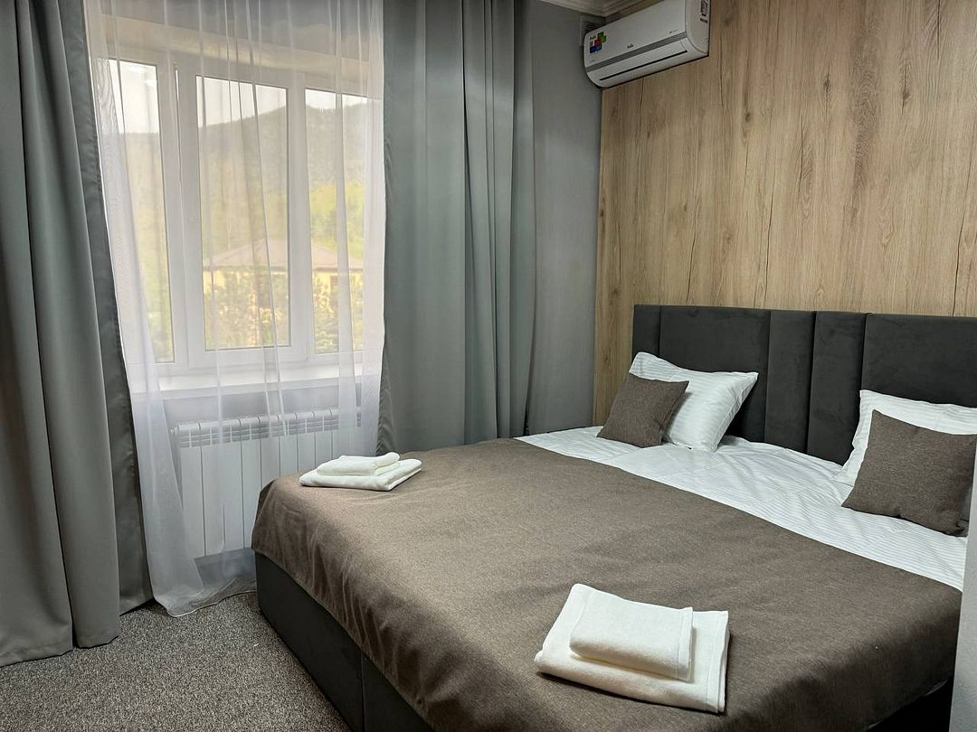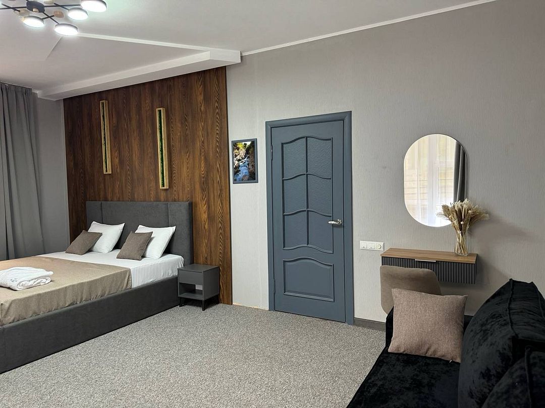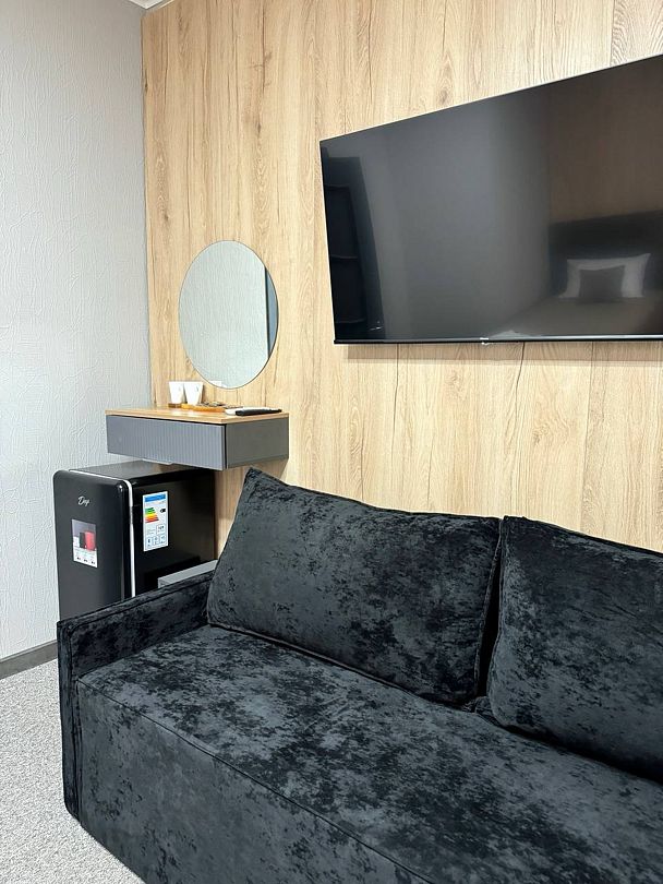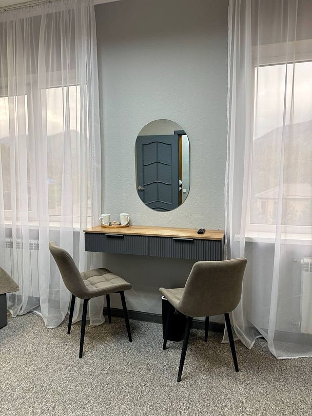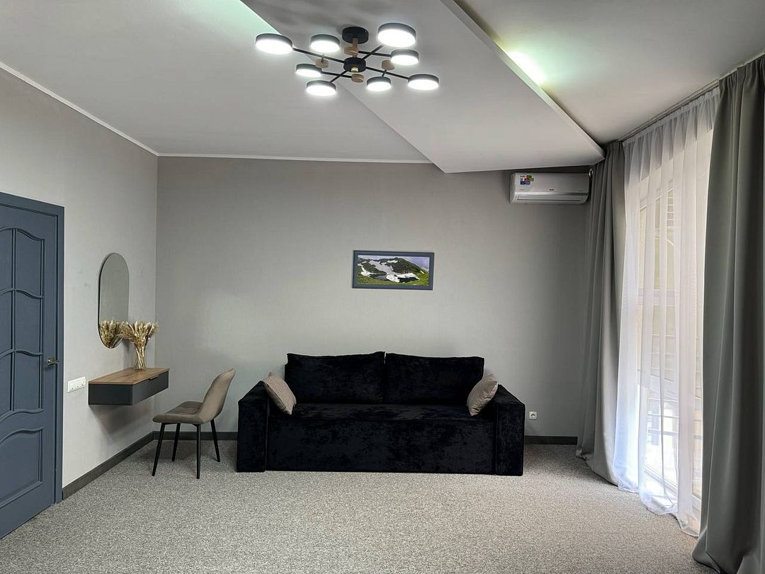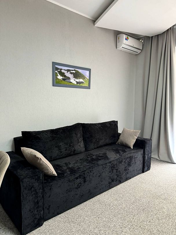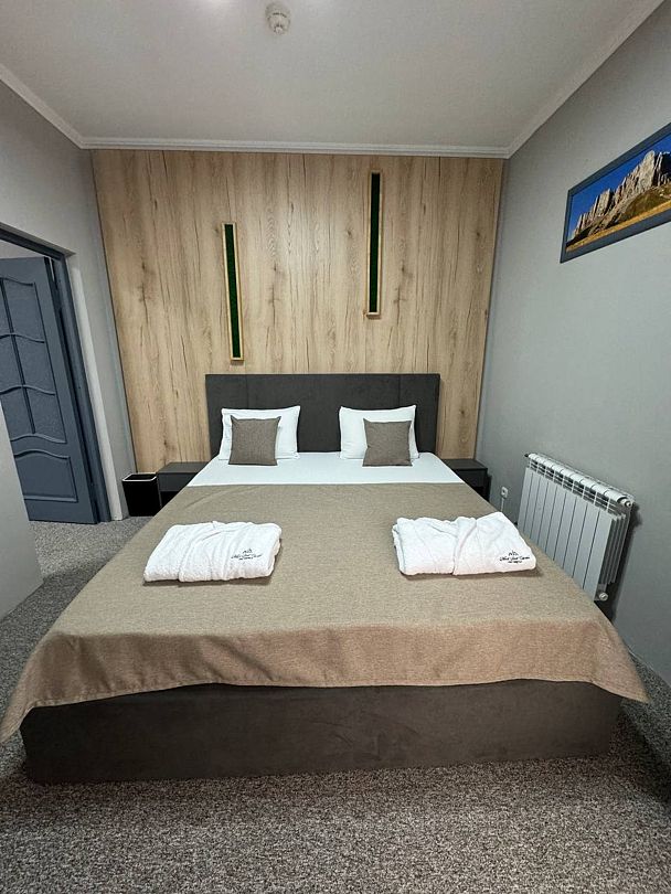 Двухкомнатный номер категории полулюкс 35 кв м с панорамными окнами, балконом и видом на горы расположен на 3-ем этаже.