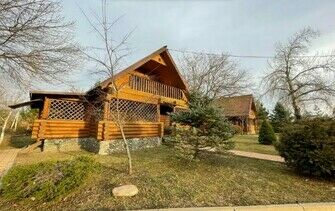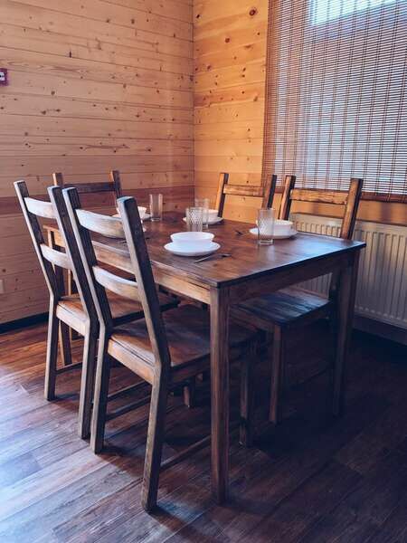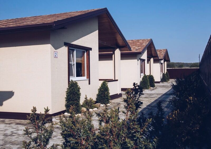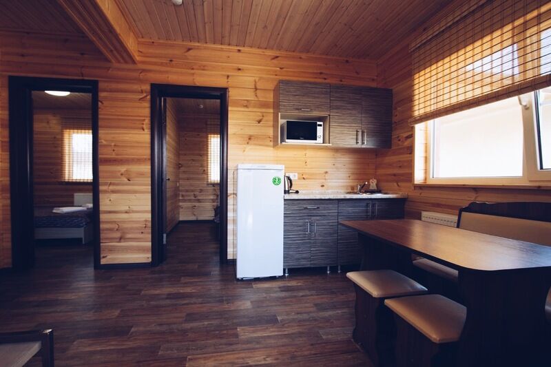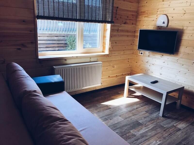 Трехкомнатный дом с оборудованной мини-кухней (холодильник / СВЧ / чайник / посуда), санузлом, душевой кабиной и полотенцами. В гостиной имеется двуспальный диван, телевизор и столик.