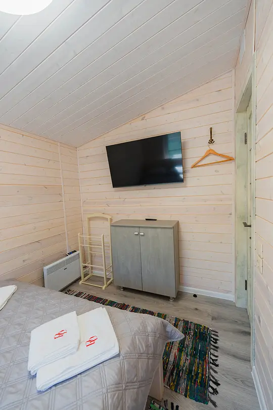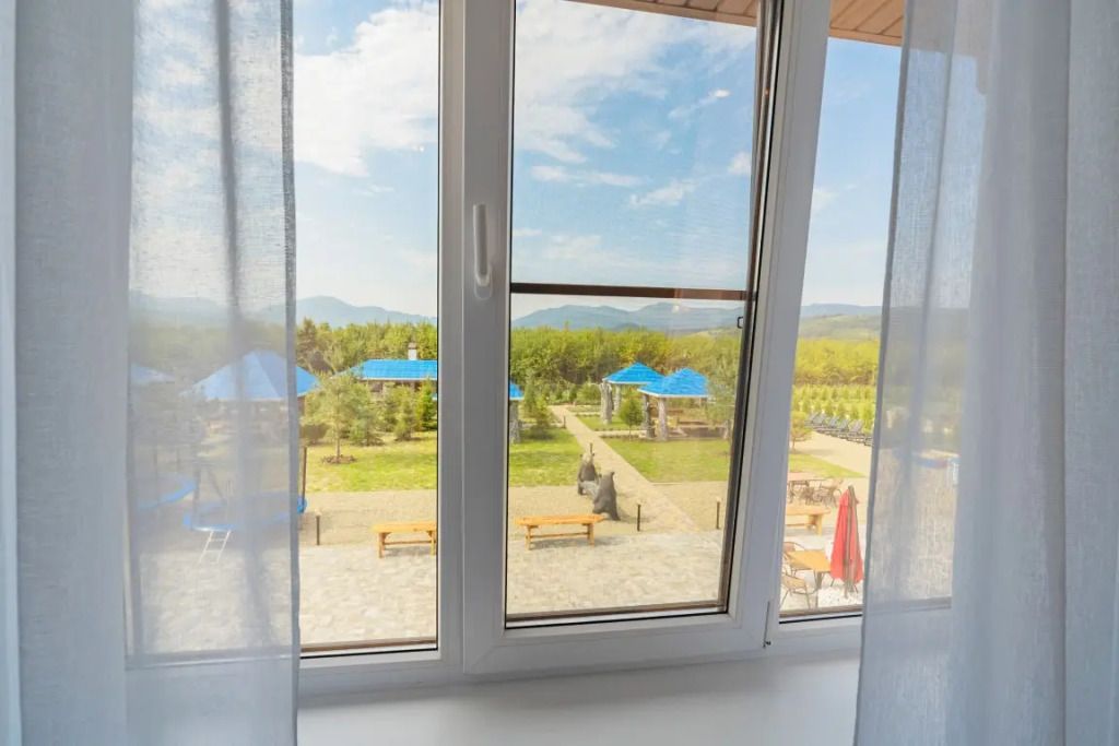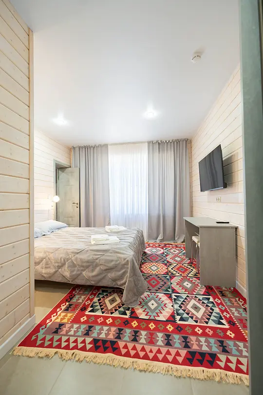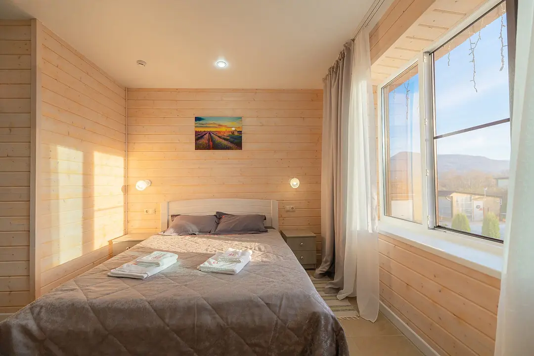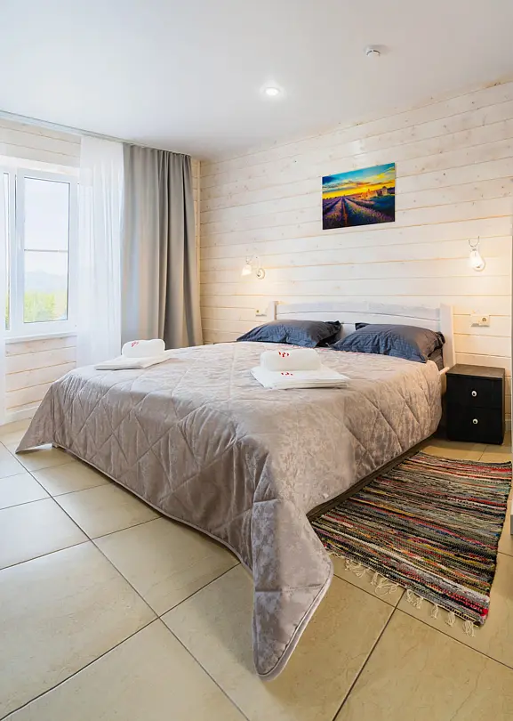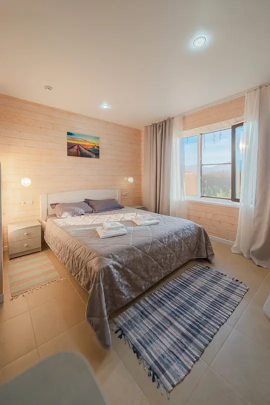 Номера оформлены в эко-стиле с использованием натуральных материалов, а постельное бельё из чистого хлопка подарит вам особенно приятные моменты отдыха. Из окон открываются потрясающие виды на горные пейзажи и лесные просторы, которые меняются в зависимости от времени суток.