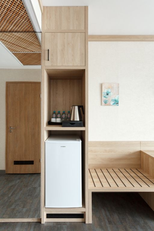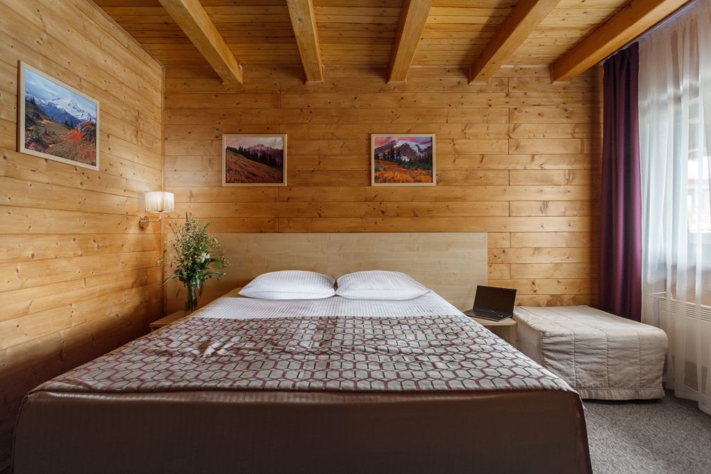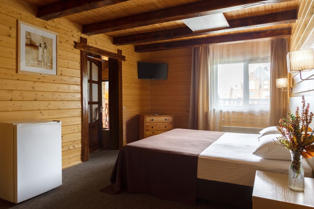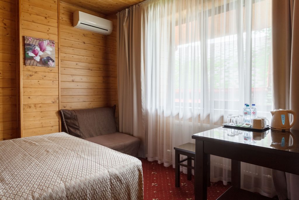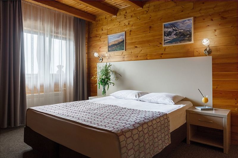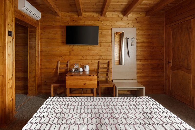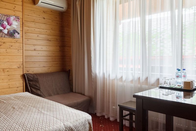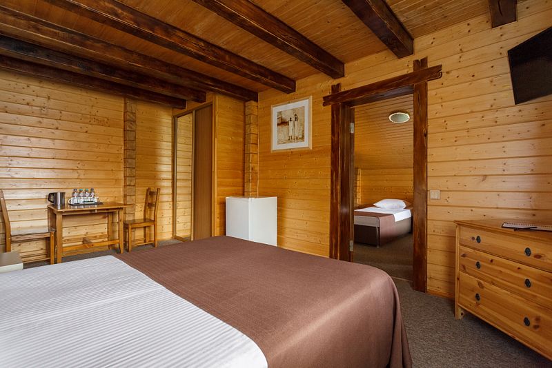 В отеле несколько корпусов, мы жили в деревянном в стиле шале. Номер небольшой, но все необходимое имеется, чисто. Большая парковка, бассейн.
