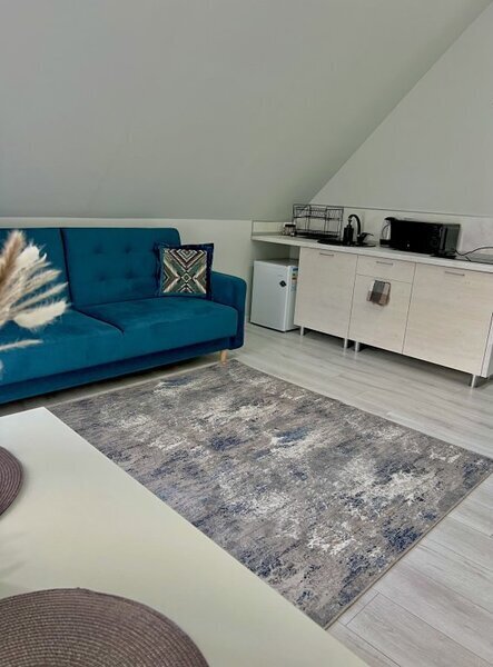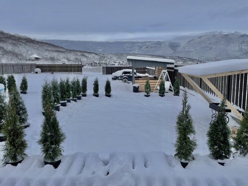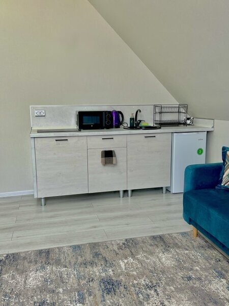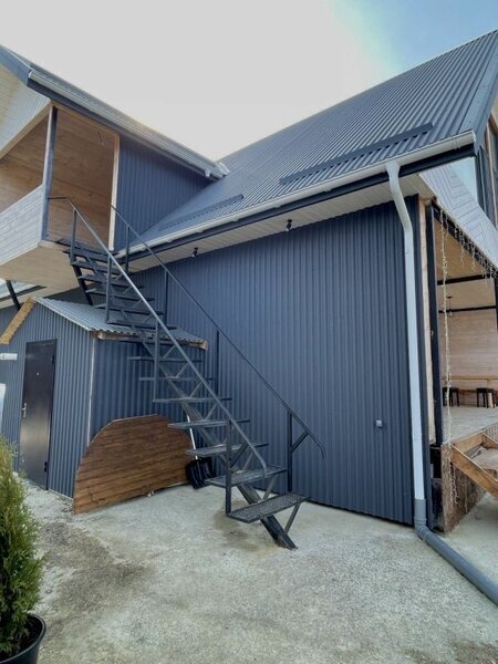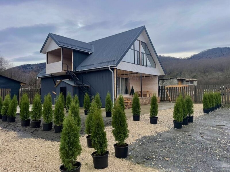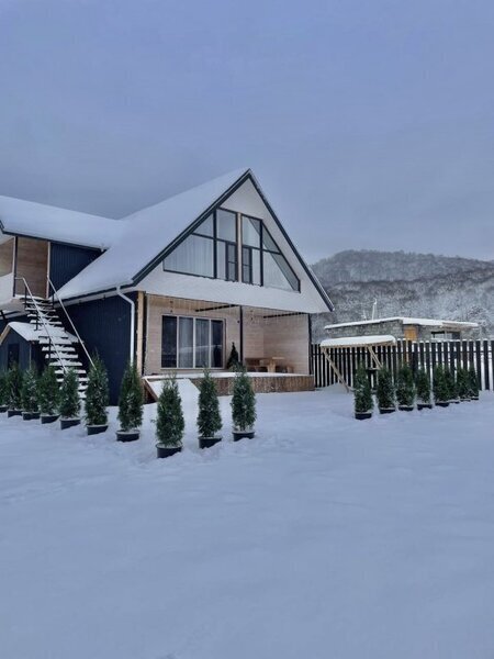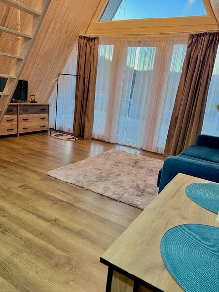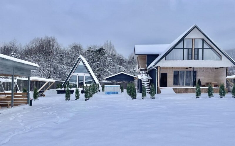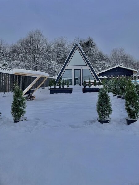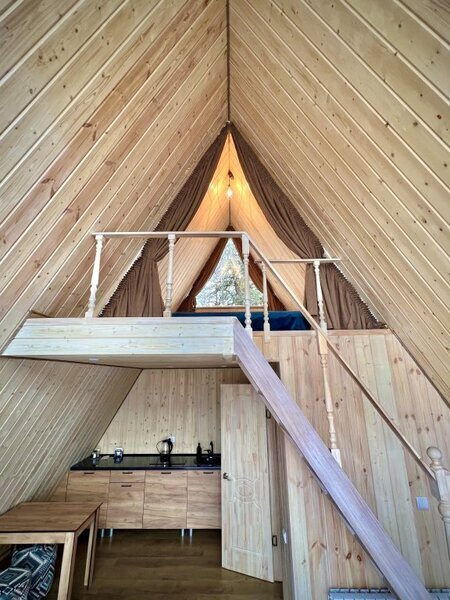 На территории расположен отдельный двухэтажный дом А-frame, который может вместить до 4 гостей. На первом этаже находится: кухня, гостиная с раскладным диваном и санузел. Ha втором этаже находится спальня.