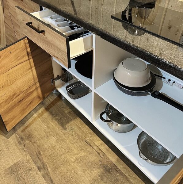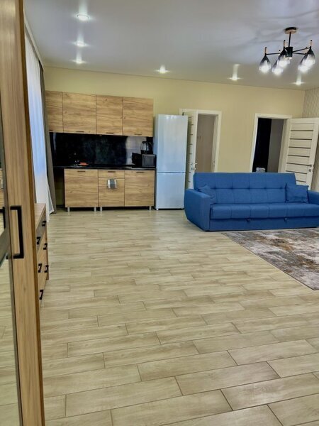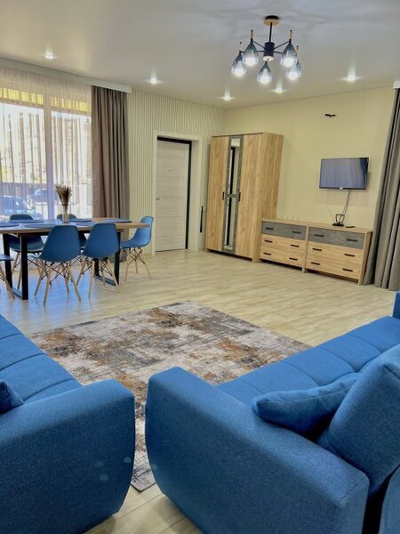 На первом этаже могут расположиться до 8 гостей. Этаж состоит из гостиной, где расположено два раскладных дивана, двух спален, кухни, санузла, собственной веранды с панорамным видом и мангальной зоны. Дом оснащён тёплыми полами. Также на первом этаже действует сауна с эффектом русской бани, за дополнительную плату.