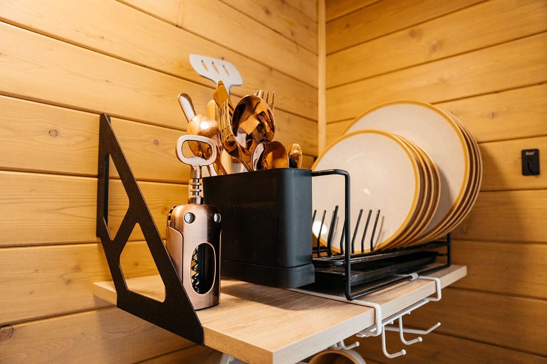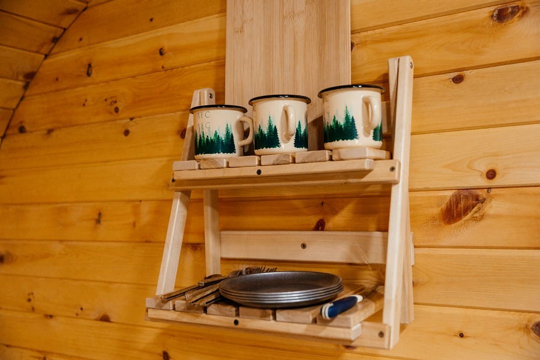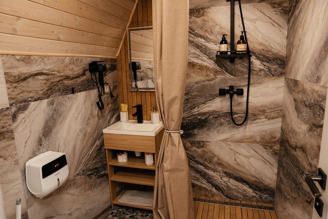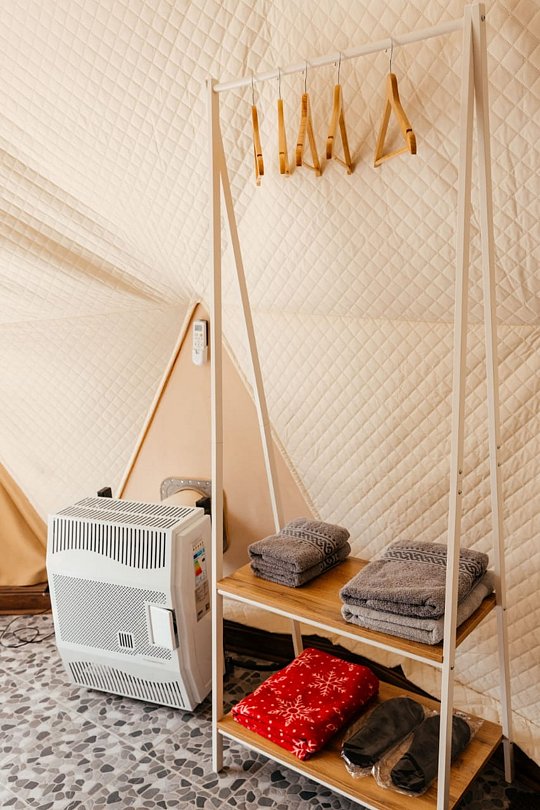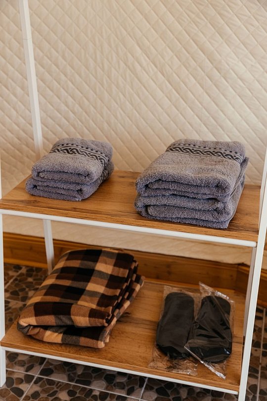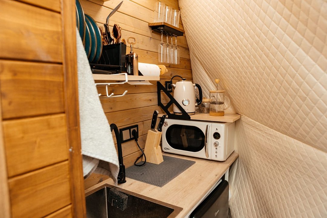 В каждом домике уже имеются свежие полотенца, средства личной гигиены, посуда, ручной отпариватель и многое другое. Также каждый глэмпинг оснащен системой теплых полов и сплит системой.