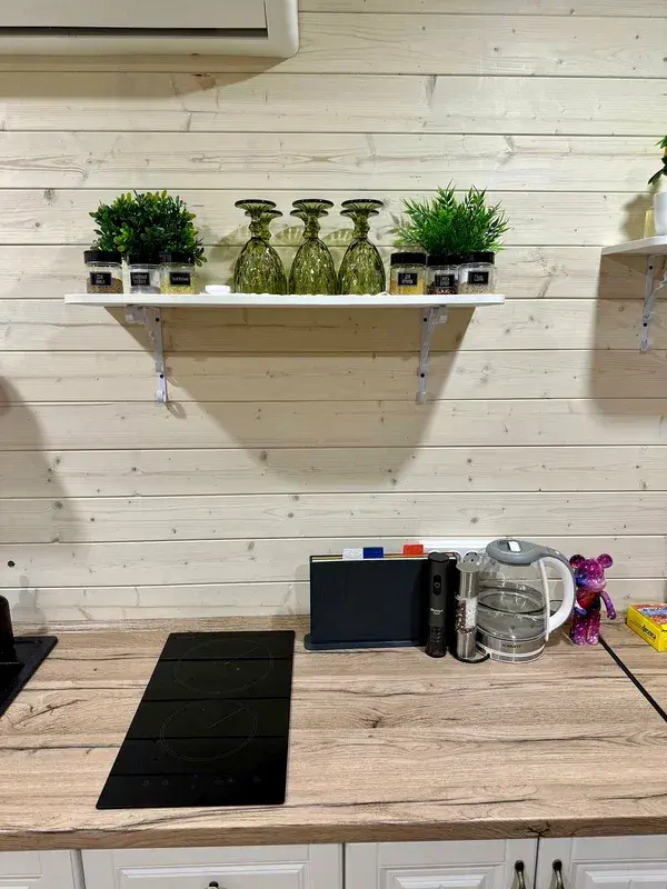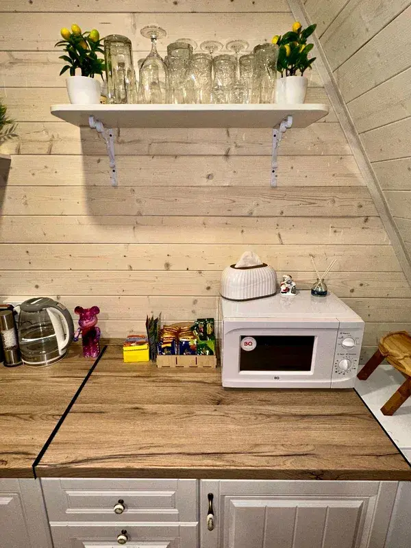 Кухня полностью оборудована: плита, микроволновая печь, чайник и холодильник. Есть наборы посуды для готовки и сервировки, чай, кофе, сахар, специи, сухие завтраки. Гостям предоставляется шампунь, бальзам, гель для душа и зубные наборы в индивидуальных упаковках. Также есть ватные диски и палочки, мицеллярная вода и одноразовые тапочки.