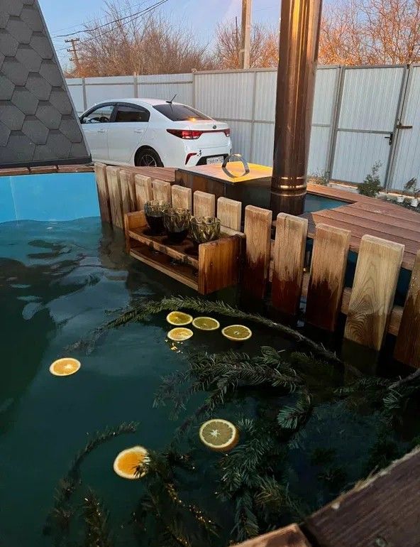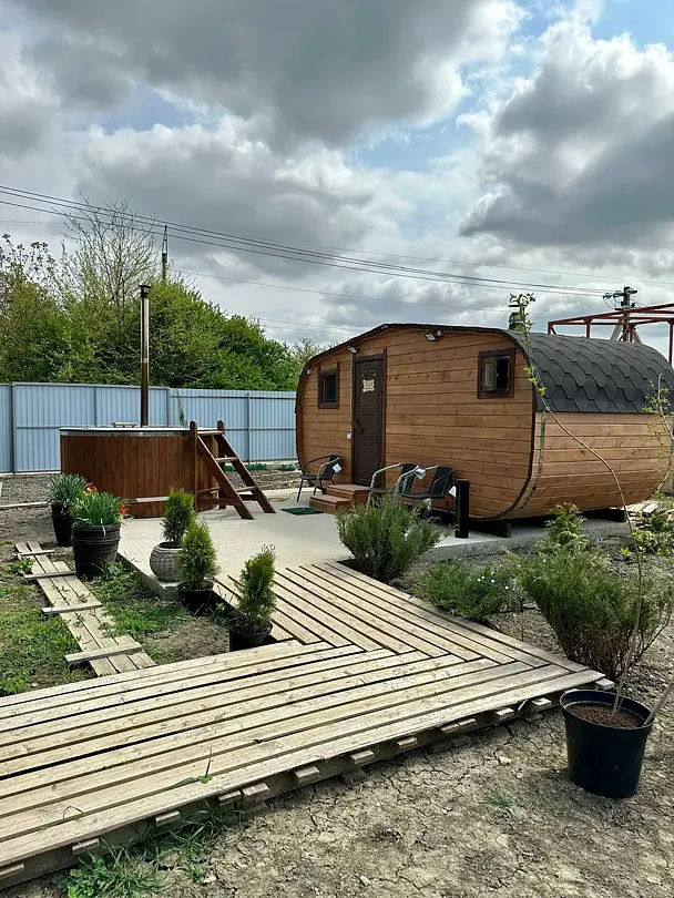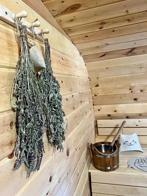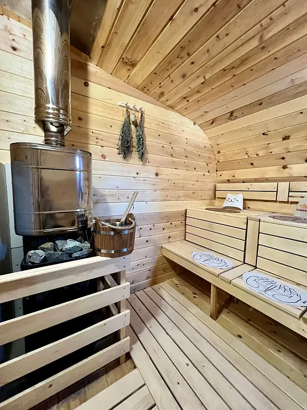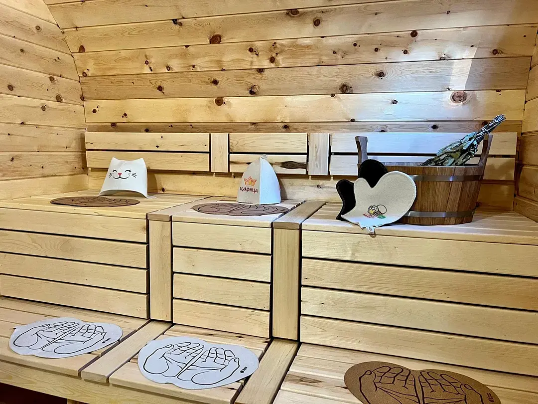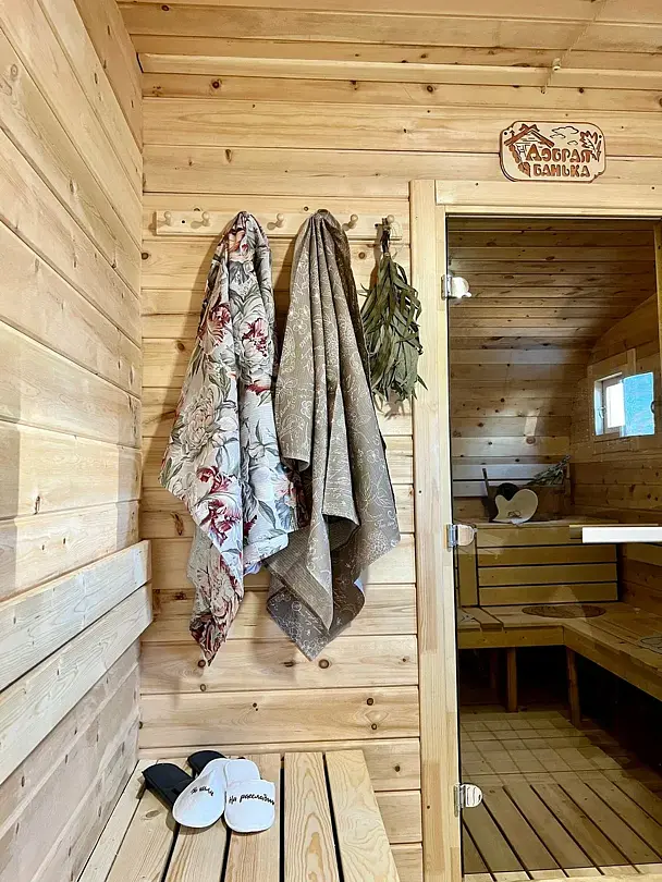В стоимость аренды бани входят холодная купель, зона для мангала и чай на целебных травах с медом. Дополнительно вы можете арендовать полотенца и тапочки. Для посещения необходимо записаться заранее за три часа.