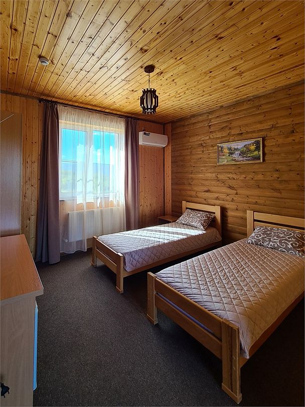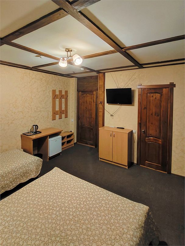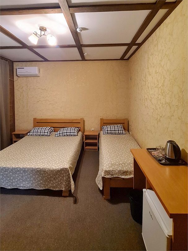 Две односпальные кровати 80*200, холодильник, телевизор, стол, шкаф или комод, чайник, кружки, (2-3 этаж кондиционер сплит-система) ванная комната.