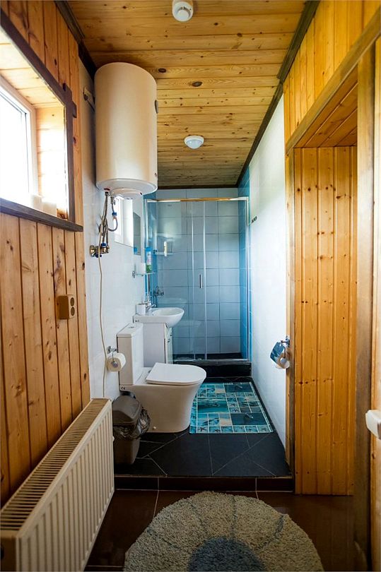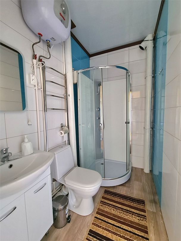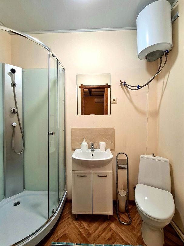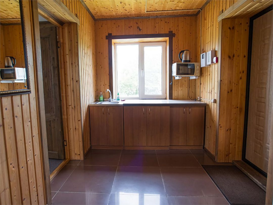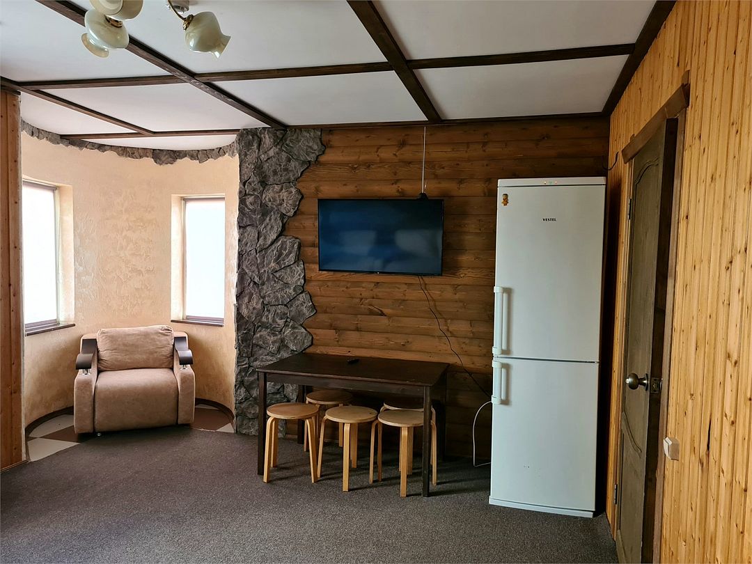 На первом этаже — кухонная зона (СВЧ, холодильник, электрический чайник) гостиная с раздвижным диваном, креслами, телевизором, совмещенный санузел.