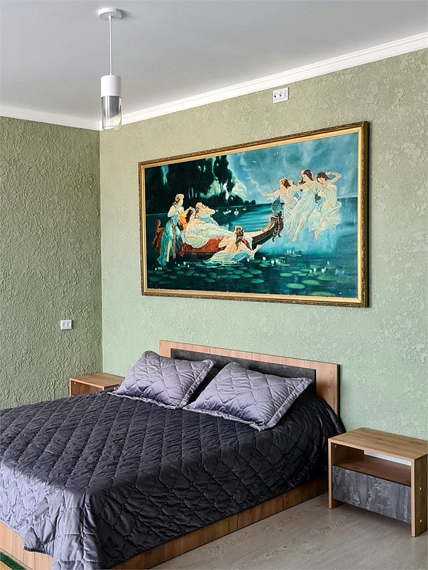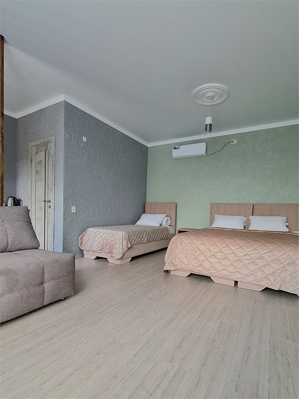 Двуспальная кровать 160*200, односпальная кровать 80*200, холодильник, телевизор, стол, комод, чайник, кружки, сплит-система, ванная комната.